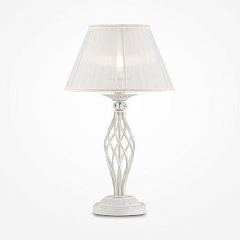 Die Maytoni Grace Tischleuchte (ARM247-00-G) besticht durch klassischen Stil und luxuriöses Design. Ein weiß-goldfarbener Metallrahmen wird von einem eleganten, gerafften Organza-Lampenschirm getragen, während funkelnde Kristallanhänger dekorative Akzente setzen und das Licht stilvoll brechen. Die Leuchte vereint hochwertige Materialien mit glamouröser Ästhetik.