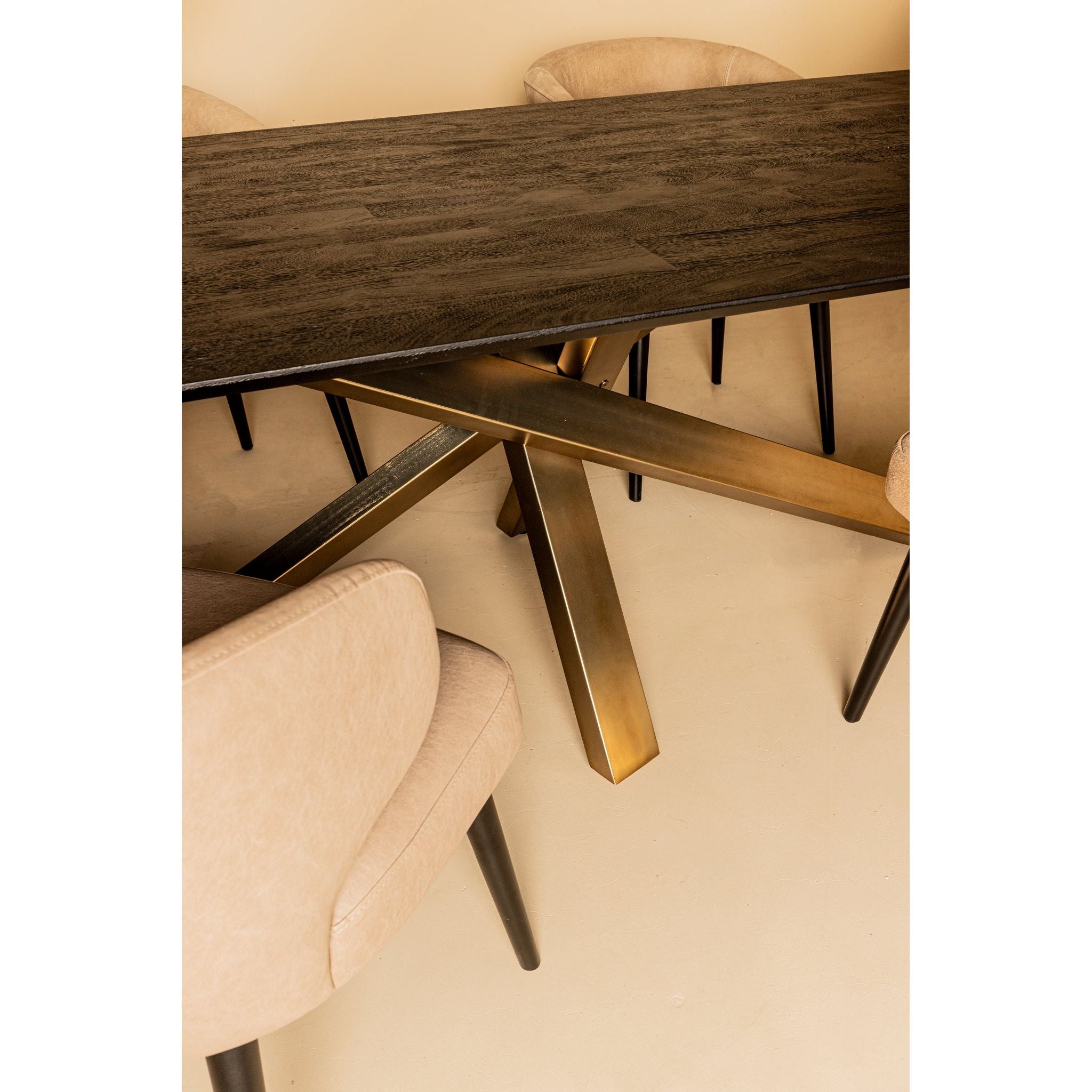 Der Alore Braun Gold Esstisch vereint natürliche Wärme mit edlem Design und wird schnell zum stilvollen Mittelpunkt jedes Essbereichs. Die Tischplatte aus Mangoholz besticht durch ihre lebendige Maserung und den warmen Braunton, der dem Raum eine einladende Atmosphäre verleiht. Durch die handveredelte Oberfläche erhält jedes Möbelstück einen individuellen Charakter, der Natürlichkeit und Eleganz harmonisch miteinander verbindet.