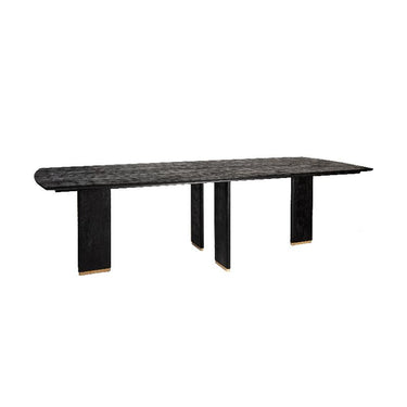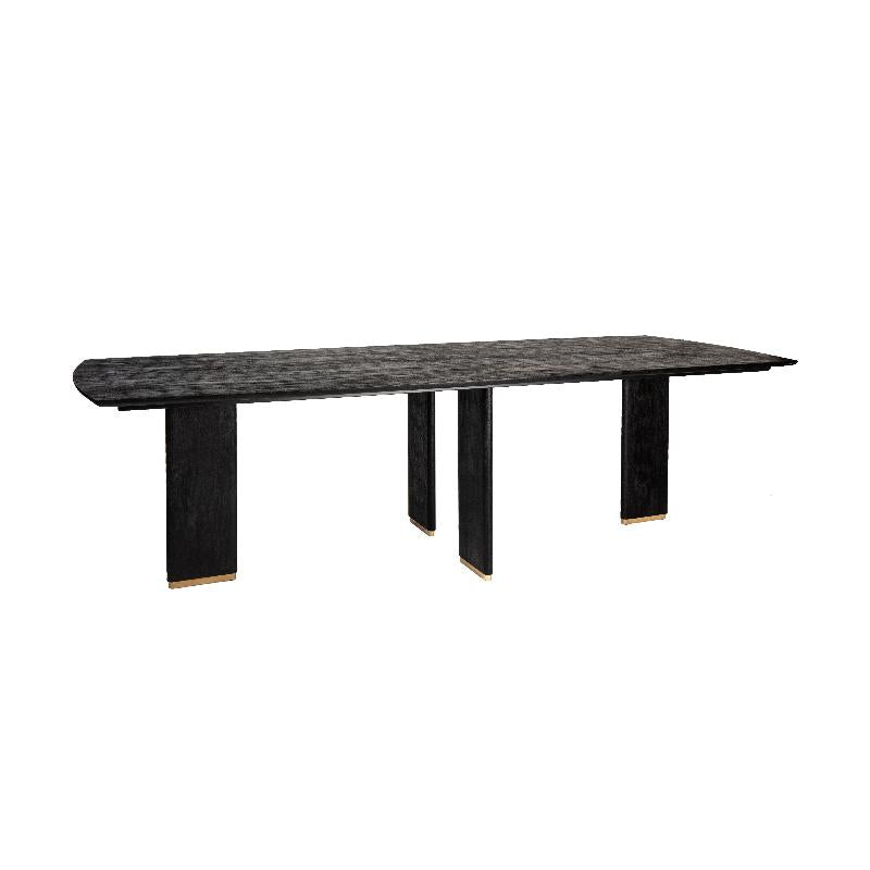 Hervorgehoben wird das Design durch die goldfarbenen Metallbeine, die einen stilvollen Kontrast zur dunklen Tischplatte bilden und dem Tisch einen Hauch von Glamour verleihen. Die stabile Konstruktion bietet eine zuverlässige Basis, die sowohl optisch als auch funktional überzeugt. Der Liber Schwarz Esstisch eignet sich perfekt für großzügige Essbereiche, gesellige Abende und repräsentative Wohnräume – ein markantes Statement-Piece, das Eleganz, Natürlichkeit und modernen Luxus ideal vereint.