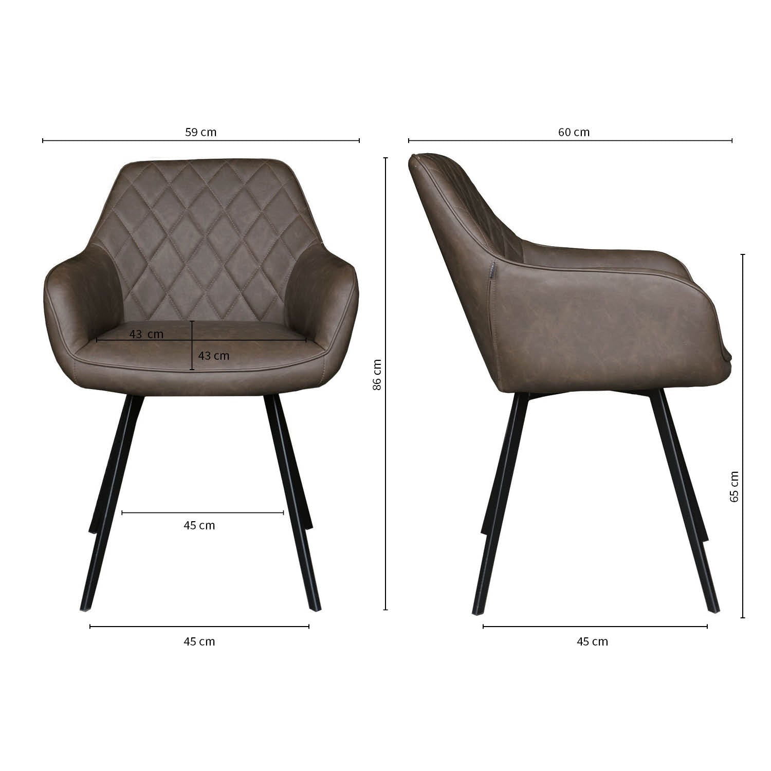 Mit einer Breite von 59 cm, einer Tiefe von 60 cm, einer Höhe von 86 cm, einer Sitzhöhe von 50 cm und einer Sitztiefe von 43 cm bietet der Karl-Stuhl ergonomischen Komfort. Die Armlehnenhöhe von 65 cm unterstützt eine entspannte Sitzposition. Hergestellt aus hochwertigem PU-Leder und robustem Metall, garantiert der Stuhl Langlebigkeit und zeitlose Eleganz und eignet sich perfekt für Wohn- und Arbeitsbereiche gleichermaßen.