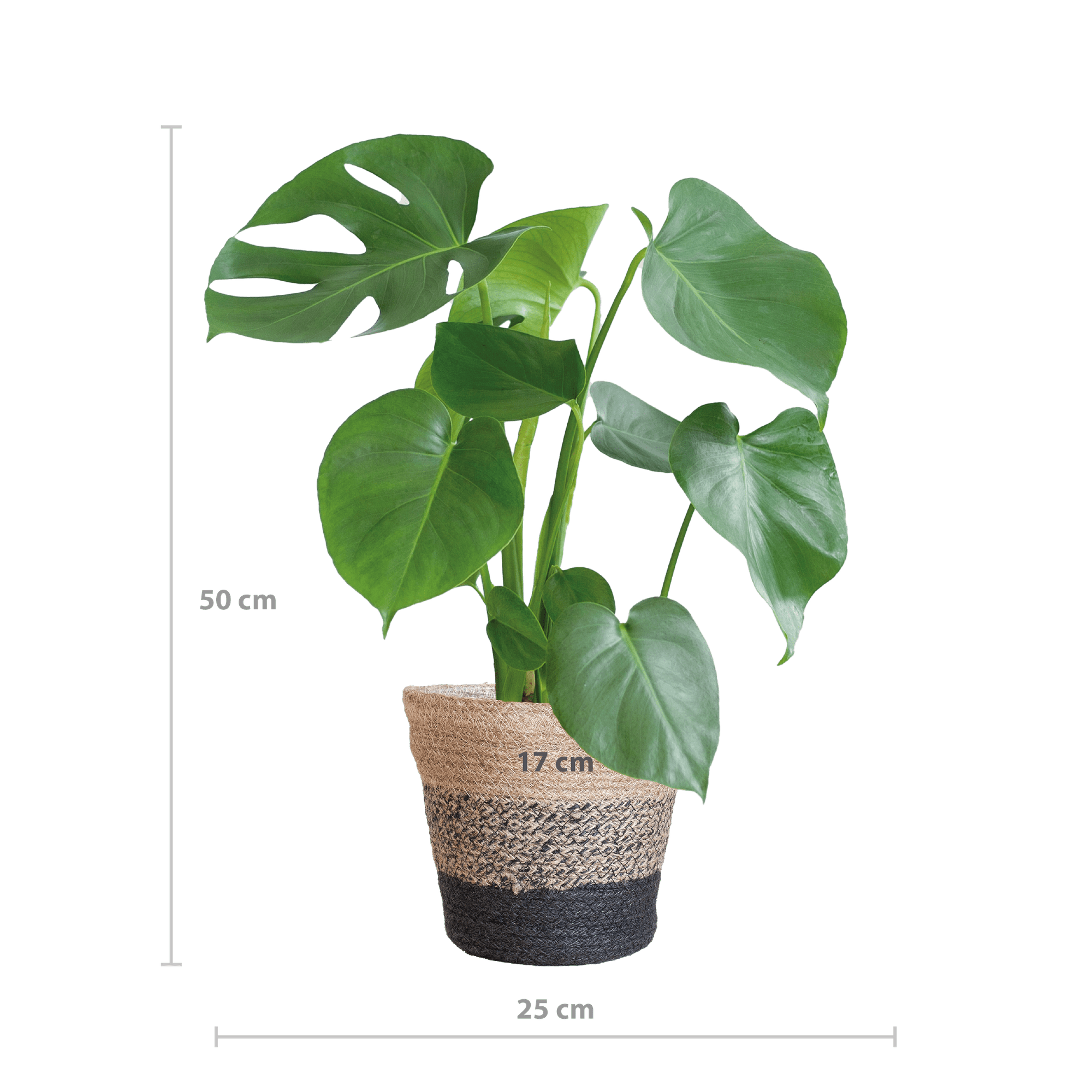 Pflanzenart: Monstera deliciosa (Fensterblatt / Schweizer Käsepflanze) Blattwerk: Große, herzförmige grüne Blätter mit natürlichen Schlitzen – ikonisch und dekorativ Herkunft: Tropisches Südamerika – klettert mithilfe von Luftwurzeln an Bäumen empor Wuchsverhalten: Klettert in freier Natur bis zu 20 Meter hoch; Blattspaltungen lassen Licht an untere Blätter Lichtbedarf: Bevorzugt indirektes Licht – ideal für helle, schattige Innenräume Feuchtigkeitsbedarf: Liebt feuchte Umgebungen – regelmäßiges, aber mäßiges Gießen erforderlich Besonderheit: Junge Blätter haben oft noch keine Schlitze; diese entwickeln sich mit der Zeit Namensbedeutung: Monstera bedeutet „seltsam“ auf Latein; deliciosa bezieht sich auf ihre essbaren Früchte in freier Natur Raumwirkung: Auffälliger tropischer Akzent – verleiht jedem Raum eine kräftige, üppige Ausstrahlung Korb-Spezifikation Korbart: Pflanzenkorb „Lisbon“ Material: Handgewebtes Jute – biologisch abbaubarer, natürlicher Rohstoff Farbe: Naturtöne – harmoniert mit verschiedenen Zimmerpflanzen Herstellung: Nachhaltig produziert im Rahmen des Terima-Kasih-Projekts Nachhaltigkeit: Produktion ohne fossile Brennstoffe; unterstützt faire Arbeitsbedingungen mit ganzjähriger Beschäftigung, frischen Mahlzeiten und familienfreundlichen Arbeitszeiten