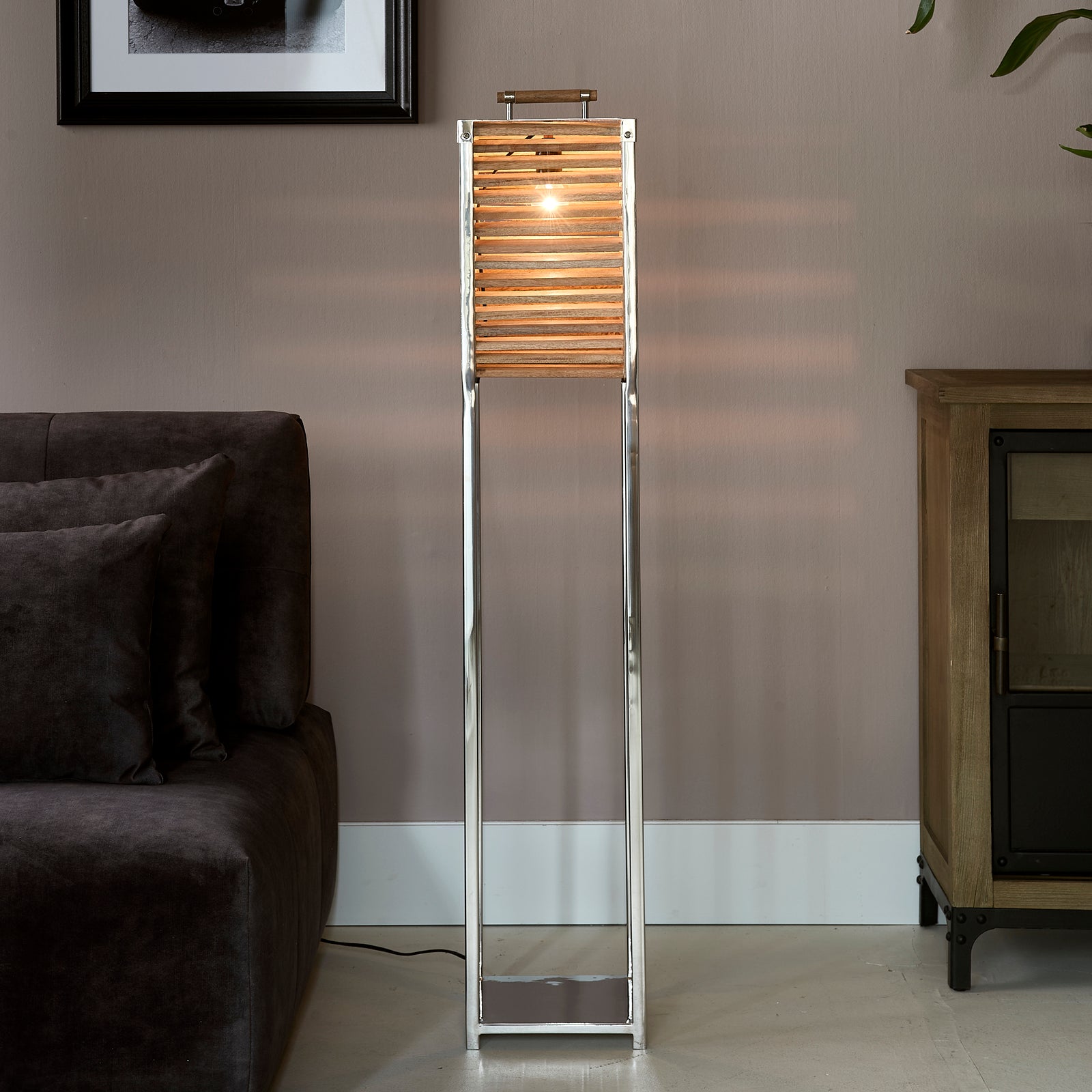 Stehlampe Silber mit Aluminiumrahmen und naturbraunen Holzlamellen 2 – Ocean Cay Shutters | Rivièra Maison