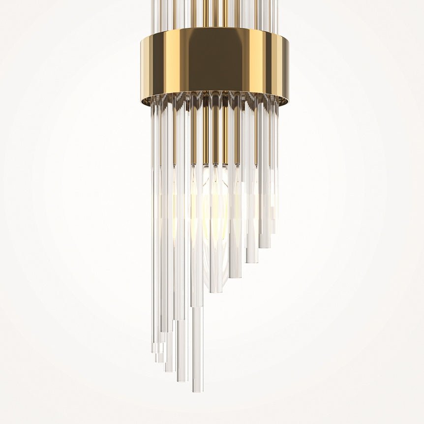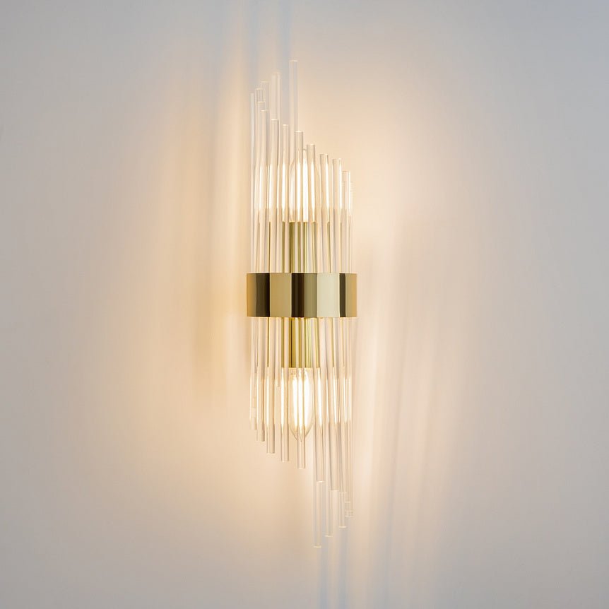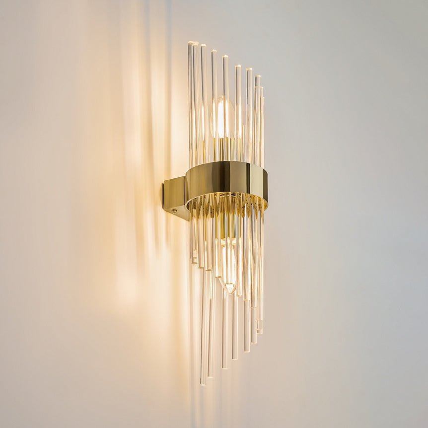 Die Maytoni MOD174WL‑02G besticht durch ihr geometrisches Design mit goldfarbenem Metallrahmen und transparenten Glasstäben, die dekoratives, stimmungsvolles Licht erzeugen.