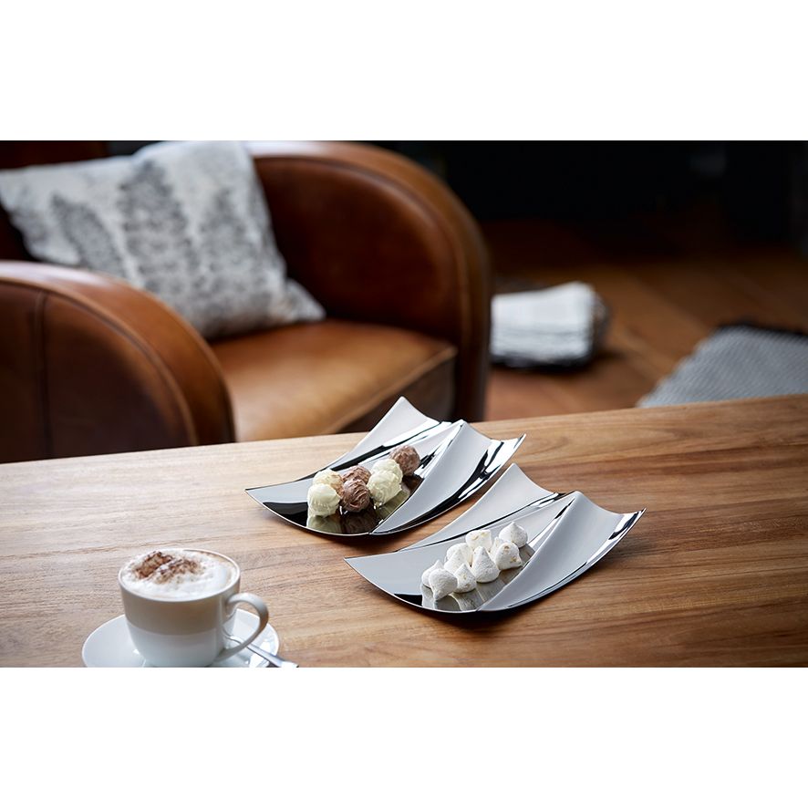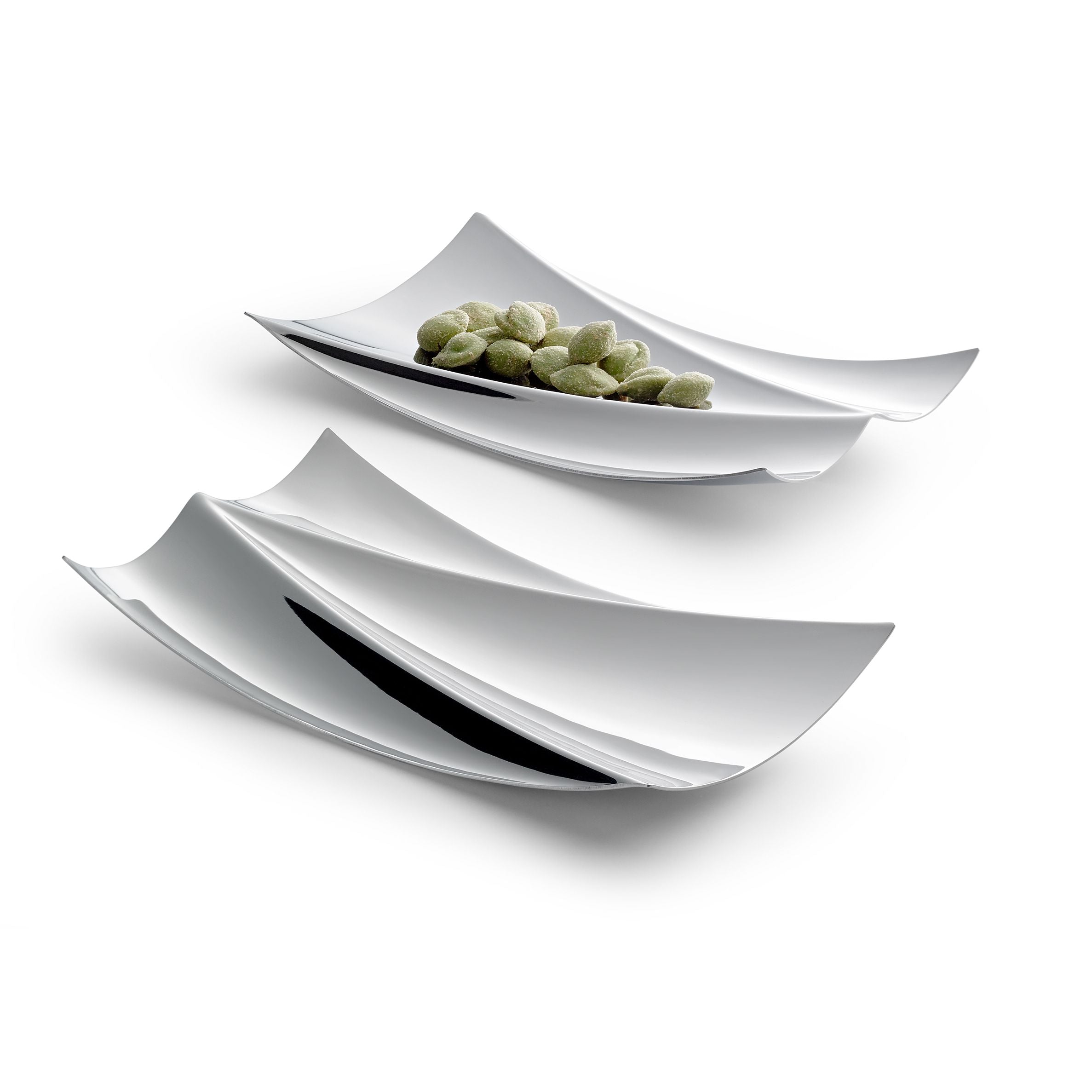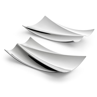 It is Hamburg's new maritime landmark, the Elbphilharmonie, also affectionately known as Elphi by residents and fans. The most striking feature is its curved roof, which is modeled on wave movement. And so it is no coincidence that the two ELBHARMONIE confectionery bowls skilfully take up this pattern and represent a beautiful reminiscence of the architectural masterpiece. Like a well-rehearsed orchestra, perfectly coordinated, the two highly polished stainless steel bowls are looking forward to their first appearance. Even in their individual performance, they impress with a strikingly elegant swing, which is modeled on a gentle wave movement. But only in pairs do they show their true strength: They can be put together either behind or next to each other in different variations to form a large bowl. Several sets lined up together create an impressive picture on a long table. Especially when they are filled with nuts, flowers or the magnificent play of colors of spices.