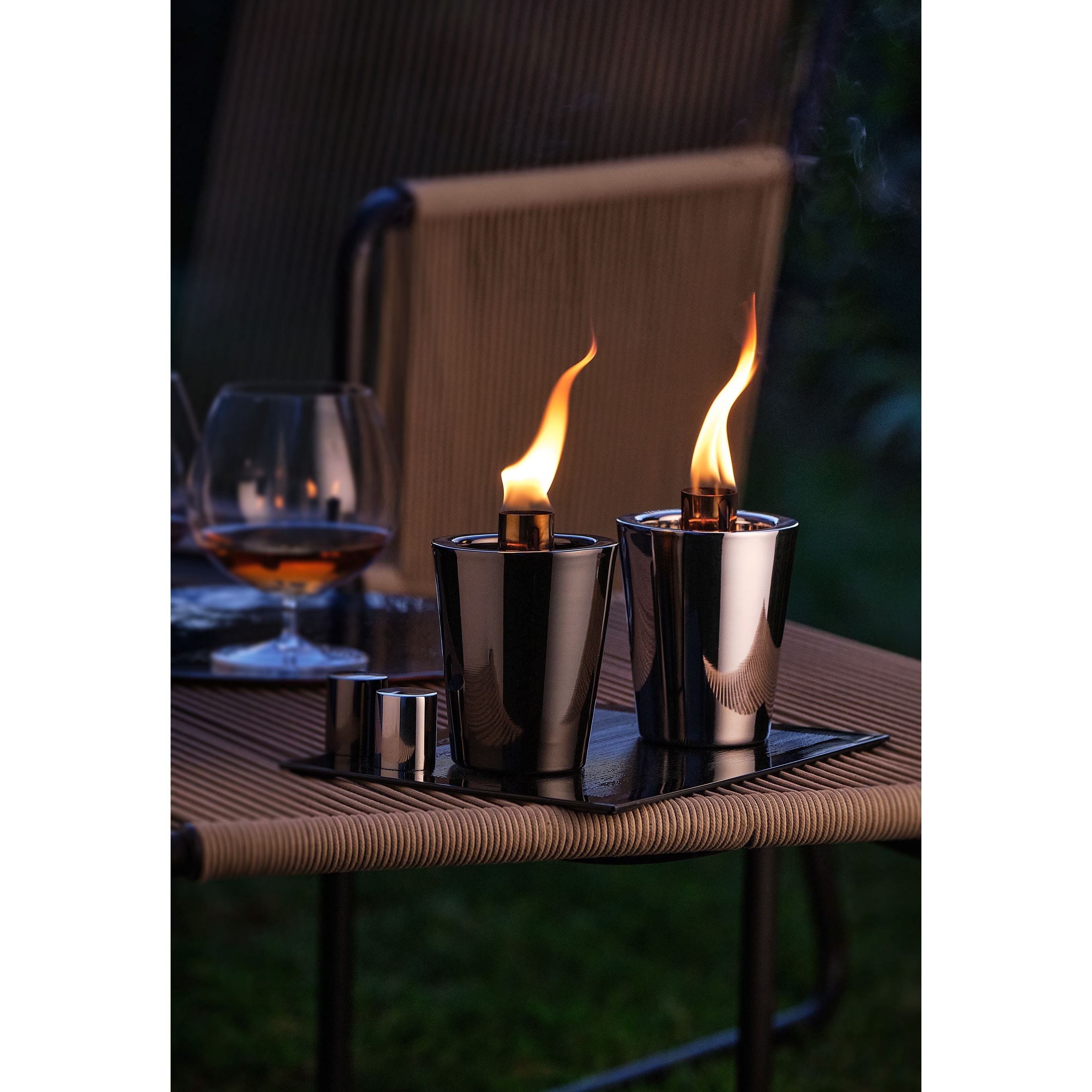 The table torch with a built-in romantic factor wraps the garden, terrace or balcony in a cozy campfire atmosphere. With just one filling of lamp/paraffin oil, TARCIA ignites into a magical long-burner for two unforgettable nights.