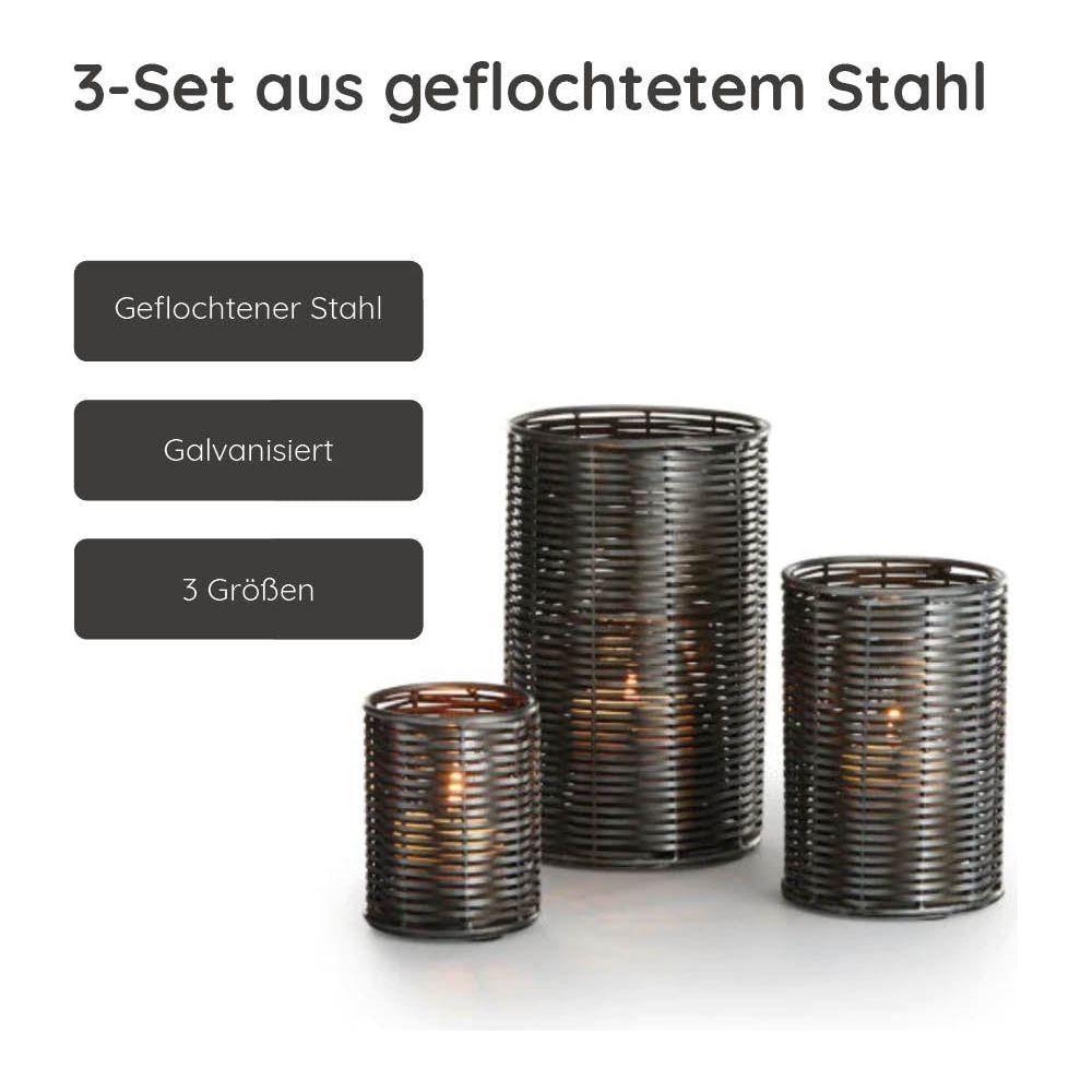 This lamp creates a magnificent optical illusion because upon closer inspection, the supposed rattan look turns out to be a mesh made of blackened steel, which fortunately is not flammable. This lamp creates a mystical atmosphere on your balcony or terrace, with gently flickering and sparkling light that is inextricably linked by the three-piece set. How beautiful that is!