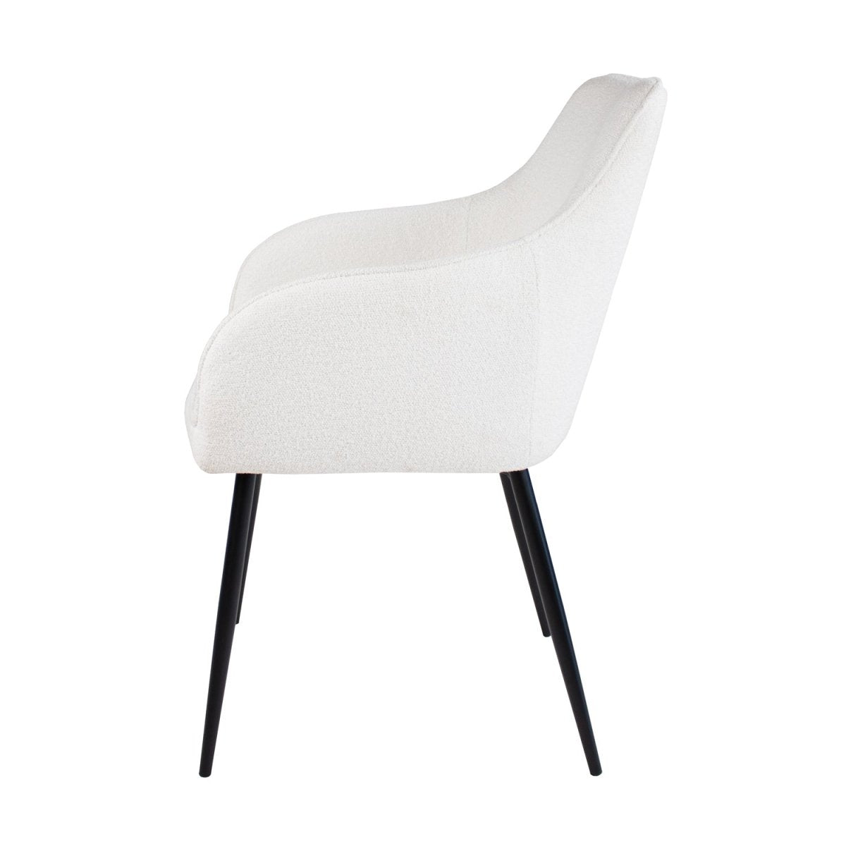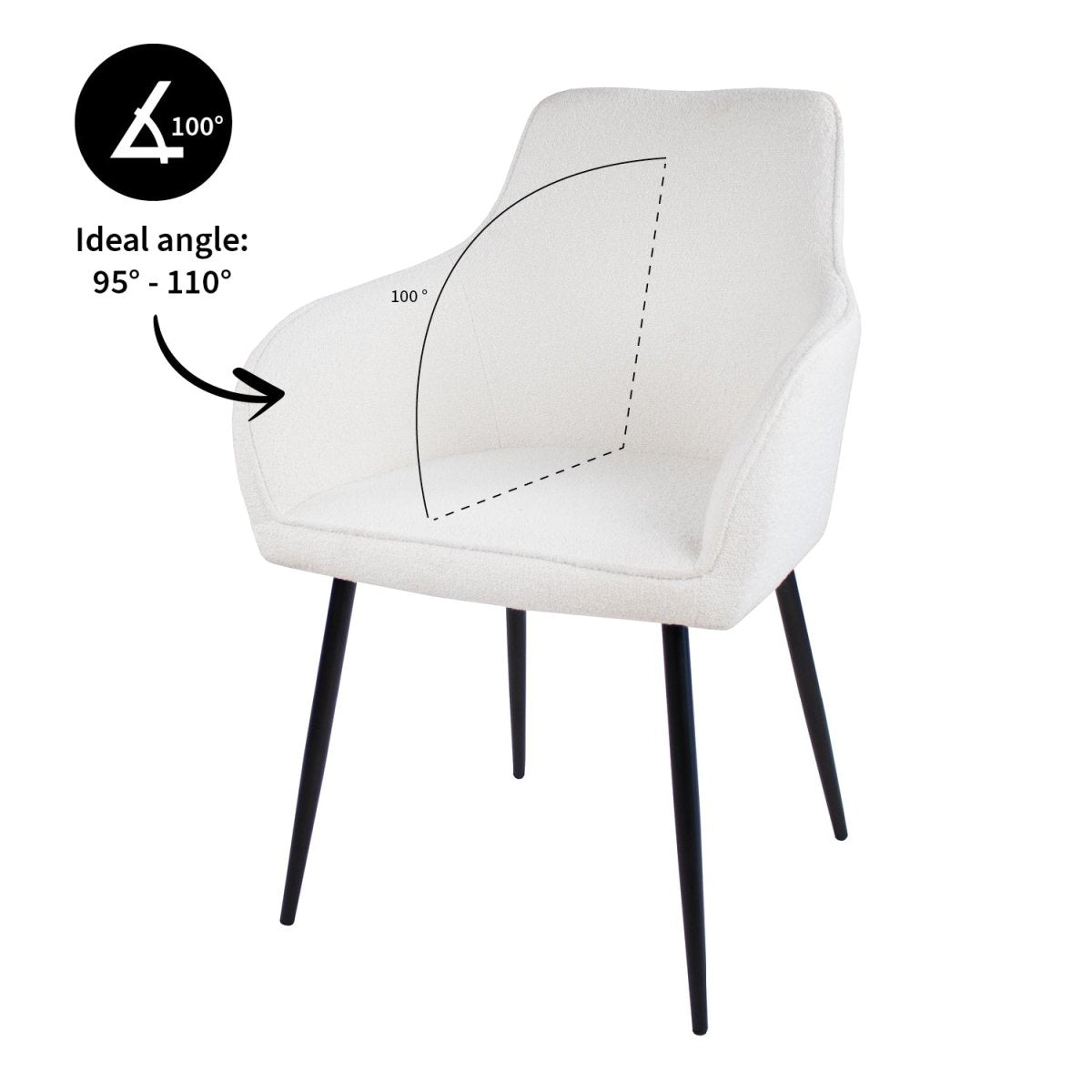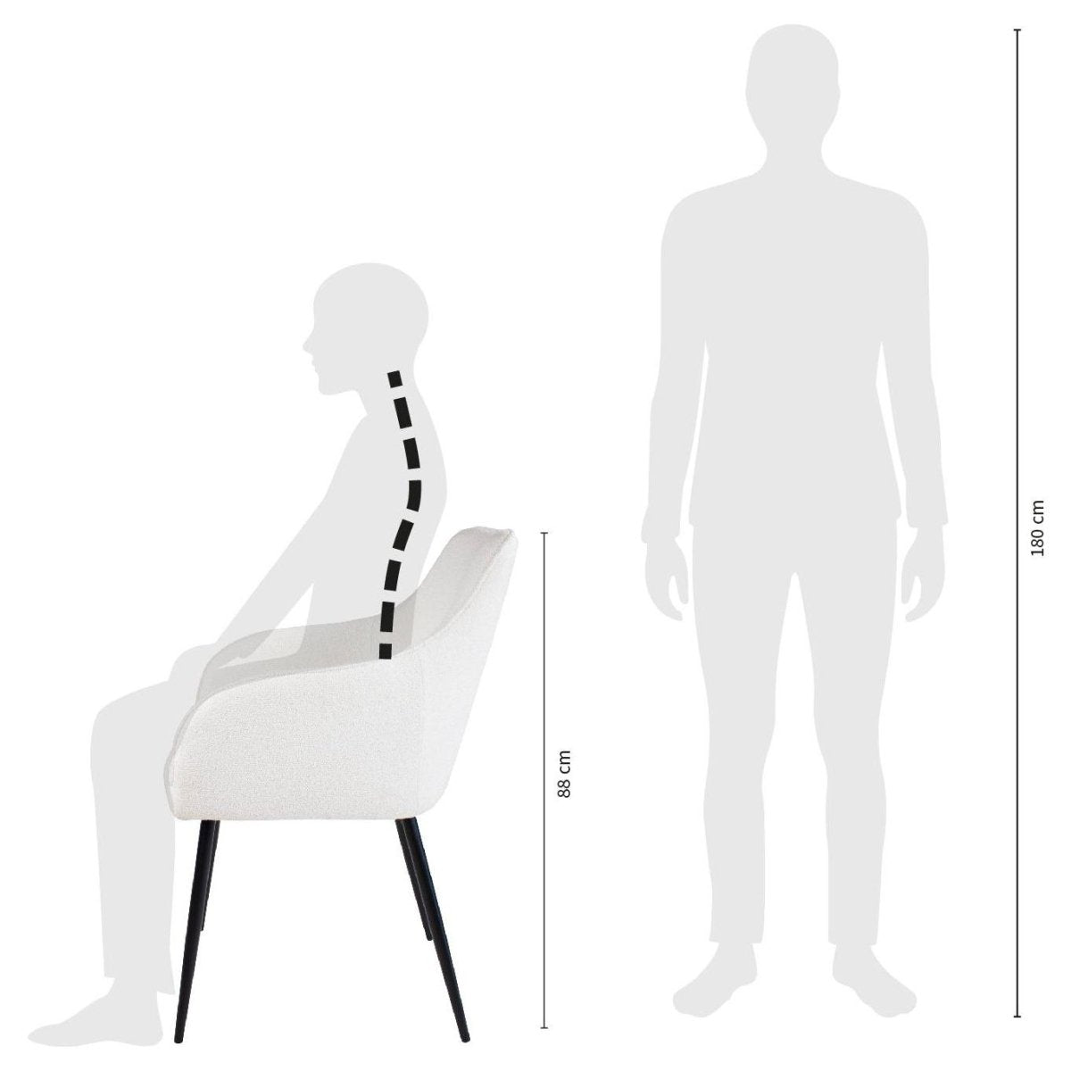 Der KICK Eetkamerstuhl Maud in Weiß vereint Komfort mit stilvollem Design. Der Stuhl ist mit luxuriösem Bouclé-Stoff bezogen, der sich weich anfühlt und eine elegante Ausstrahlung verleiht. Das schwarze Stahlgestell sorgt für Stabilität und einen modernen Look. Mit einer Breite von 58 cm, einer Tiefe von 51 cm und einer Höhe von 88 cm bietet der Stuhl eine Sitzhöhe von 48 cm und eine Sitztiefe von 44 cm. Die Armlehnen variieren in der Höhe von 64 bis 72 cm und tragen zu einer entspannten Sitzposition bei.