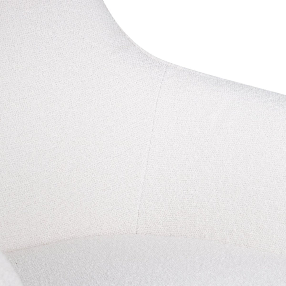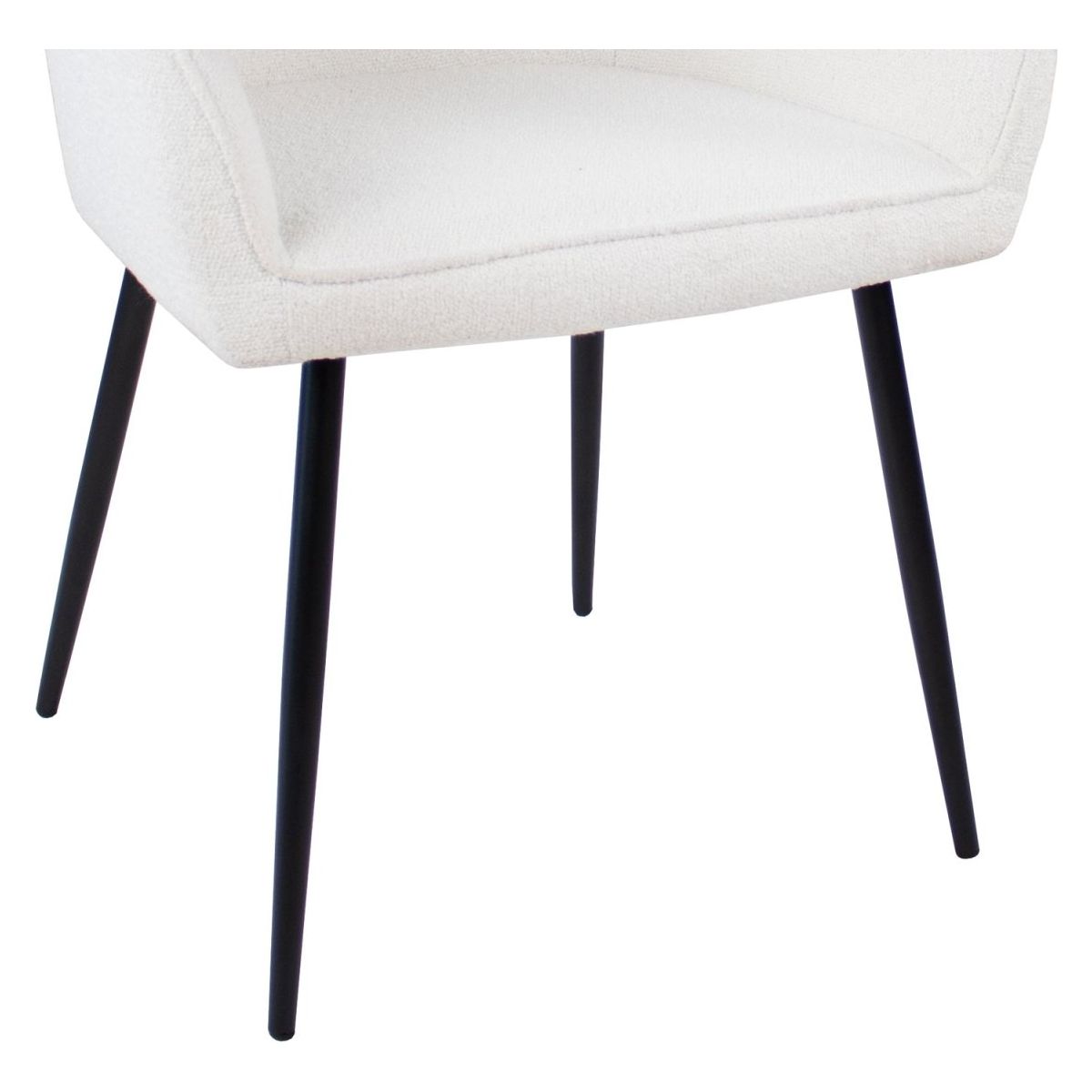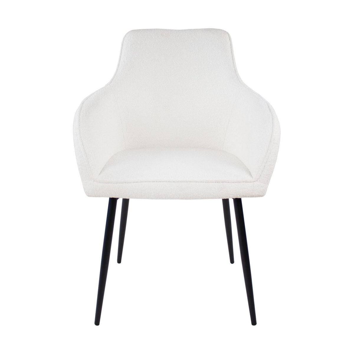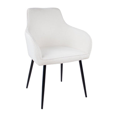 Der KICK Eetkamerstuhl Maud in Weiß vereint Komfort mit stilvollem Design. Der Stuhl ist mit luxuriösem Bouclé-Stoff bezogen, der sich weich anfühlt und eine elegante Ausstrahlung verleiht. Das schwarze Stahlgestell sorgt für Stabilität und einen modernen Look. Mit einer Breite von 58 cm, einer Tiefe von 51 cm und einer Höhe von 88 cm bietet der Stuhl eine Sitzhöhe von 48 cm und eine Sitztiefe von 44 cm. Die Armlehnen variieren in der Höhe von 64 bis 72 cm und tragen zu einer entspannten Sitzposition bei.