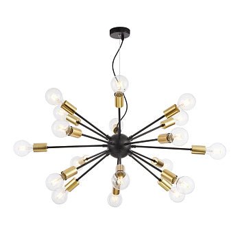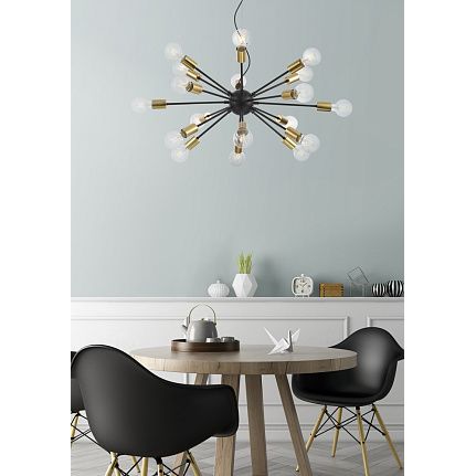 Die Maytoni Jackson T546PL-18B Pendelleuchte ist ein eindrucksvolles Statement moderner Innenbeleuchtung im industriellen Stil. Mit einem Durchmesser von 98 cm und einer verstellbaren Höhe zwischen 74,2 cm und 166,9 cm lässt sich die Leuchte optimal an unterschiedliche Raumhöhen und Einrichtungskonzepte anpassen. Der schwarze Metallrahmen verleiht der Leuchte eine markante Struktur, während die goldfarbenen Lampenfassungen einen edlen Kontrast setzen und dem Design einen Hauch von Luxus verleihen. Mit 18 E27-Fassungen (jeweils bis 7 W, Leuchtmittel nicht im Lieferumfang enthalten) erzeugt die Jackson-Leuchte eine gleichmäßige, helle und zugleich gemütliche Lichtstimmung.