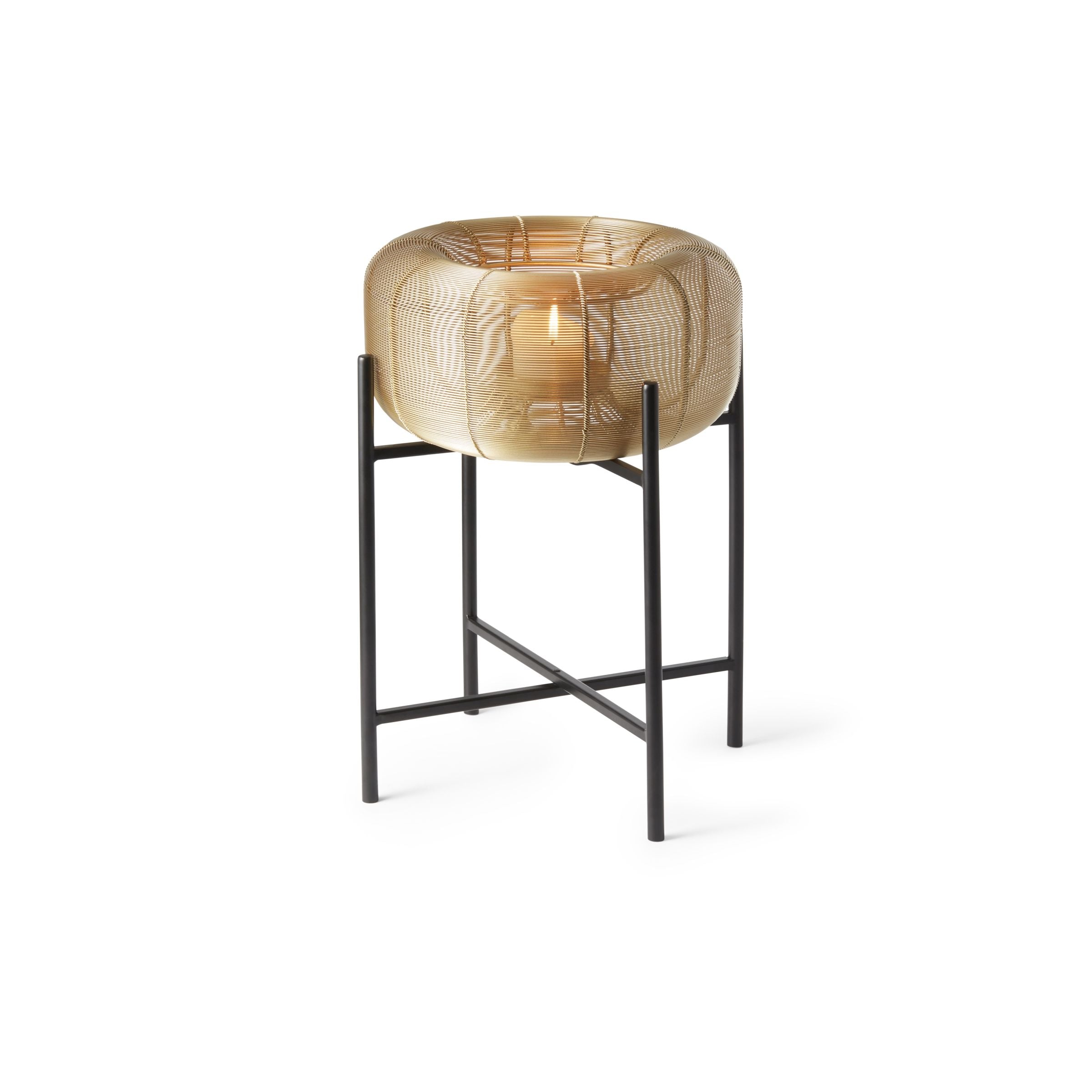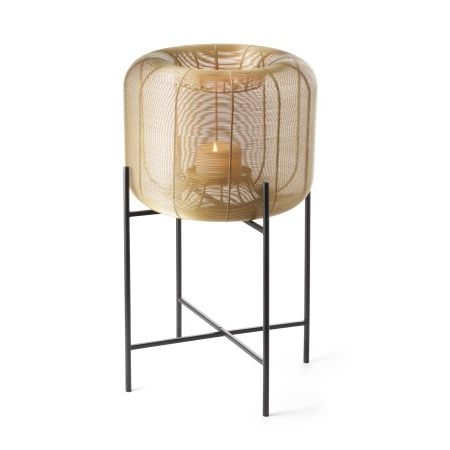 Ein schlanker, vierbeiniger Rahmen mit schwarzer Pulverbeschichtung hebt die messingbeschichtete Laterne an und verleiht ihr eine anmutige, beinahe schwebende Präsenz im Raum. Im Inneren steht die Kerze sicher auf einer kleinen Platte und wirft ein sanftes, verzauberndes Schattenspiel, das die Atmosphäre mit zurückhaltender Raffinesse bereichert.