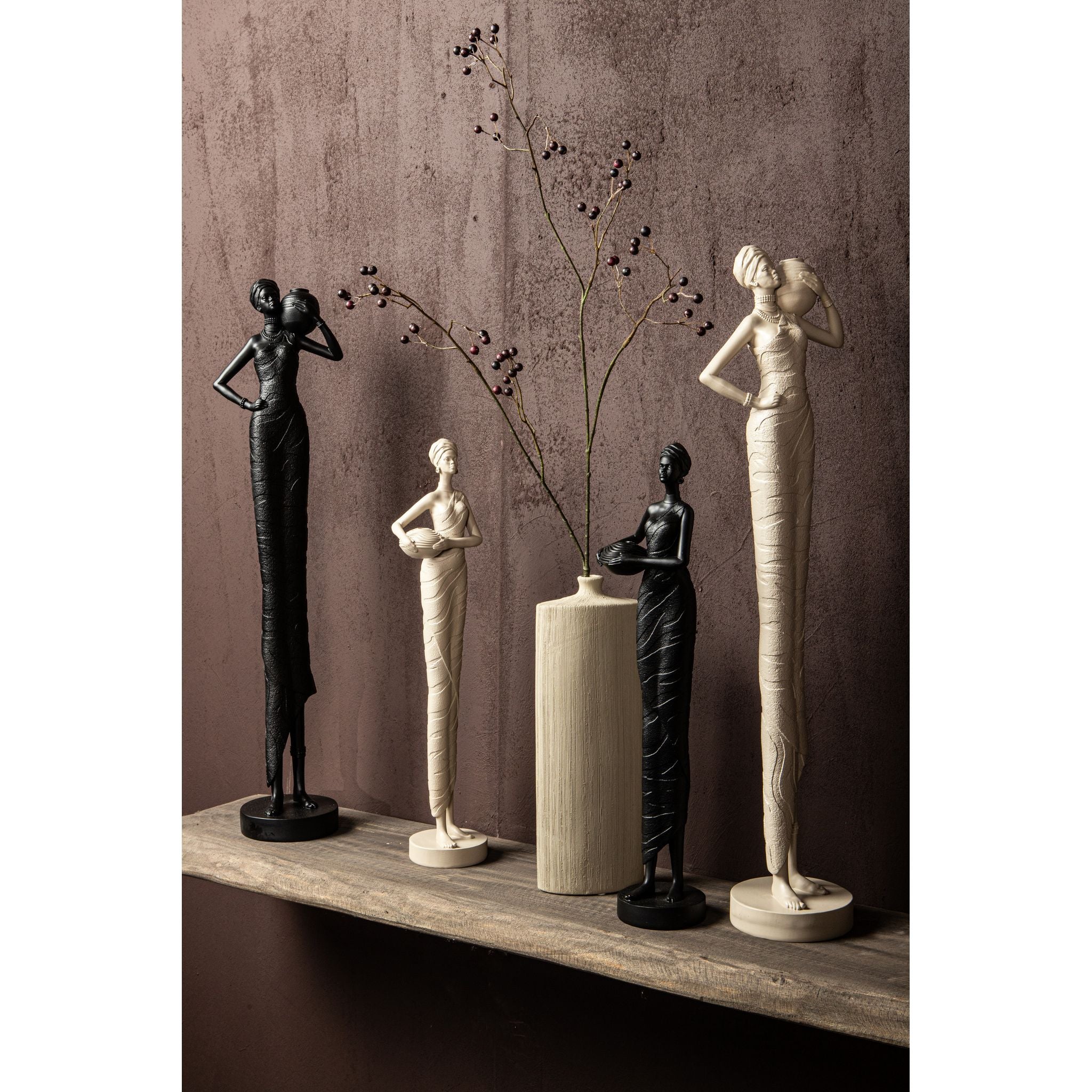 Diese skulpturale Frauenstatue von Rafah ist ein dekoratives Highlight mit ruhiger und eleganter Ausstrahlung. Die tiefschwarze Oberfläche verleiht ihr einen modernen, edlen Look, während die Figur mit dem tiefer gehaltenen Krug eine stille, künstlerische Erzählung schafft. Handgefertigt aus robustem Polyester wirkt sie leicht, aber dennoch hochwertig und stilvoll.
