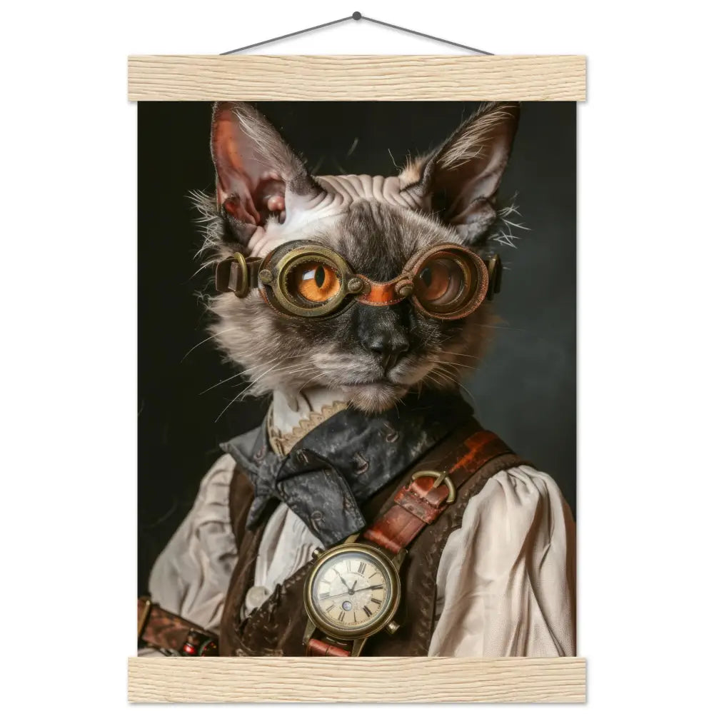 Dieses eindrucksvolle Schulposter zeigt eine weibliche Lykoi-Katze neu interpretiert als faszinierende Steampunk-Entdeckerin und verbindet geheimnisvolle Ausstrahlung mit Eleganz und zeitloser Neugier. Sie trägt eine detailreich gearbeitete braune Lederjacke mit aufwendigen Nähten und kupferfarbenen Akzenten, die dem Motiv eine zugleich raue und edle Wirkung verleihen. Eine goldfarbene Uhr im antiken Stil ruht an ihrem Hals und verleiht ihrem Erscheinungsbild nostalgischen Charakter, während retro-futuristische Schutzbrillen mit bronzefarbenen Metalldetails auf ihrem Kopf liegen und ihr den Look einer neugierigen Zeitreisenden verleihen. Elegante weiße Fellmanschetten an ihren Pfoten vollenden das Ensemble, eingebettet in einen dunklen Hintergrund, der ihre geheimnisvolle Präsenz verstärkt und den Blick auf jedes Detail lenkt.