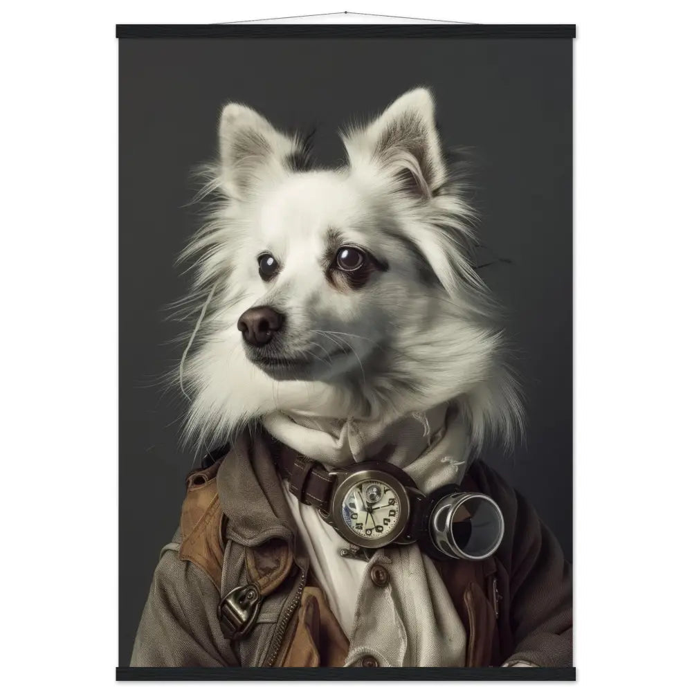 Dieses exklusive Schulposter im Art-Stil zeigt einen Amerikanischen Eskimohund in einer eleganten Vintage-Steampunk-Inszenierung mit souveräner Ausstrahlung. Die Figur trägt einen edlen grauen Mantel mit dezenten Steppnähten und feinen Lederakzenten, die der Komposition eine zeitlose und raffinierte Wirkung verleihen. Um den Hals ruht eine antik anmutende bronzefarbene Taschenuhr, die den Charme klassischer Handwerkskunst und zurückhaltenden Luxus unterstreicht. Große retro-futuristische Schutzbrillen mit silberfarbenen Metalldetails rahmen den Ausdruck und wecken den Geist eines abenteuerlichen Entdeckers. Edle, beige, fellartige Manschetten an den Pfoten vollenden das Ensemble mit einem harmonischen und stilvollen Abschluss.