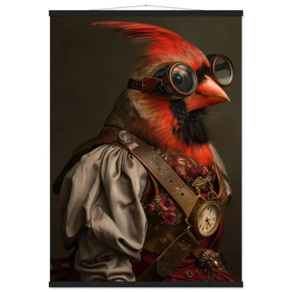 Dieses exklusive Schulposter im Art-Stil zeigt einen Kardinalvogel als faszinierende Figur in einer Vintage-Steampunk-Erzählung. Der Vogel trägt einen edlen weinroten Mantel mit opulenten floralen Mustern und dezenten goldfarbenen Akzenten, die eine luxuriöse und handwerklich anspruchsvolle Ausstrahlung erzeugen. Eine antik anmutende goldfarbene Taschenuhr hängt elegant am Hals und verleiht dem Motiv zeitlose Raffinesse. Große, runde Schutzbrillen mit bronzefarbenen Metalldetails vollenden den Look und verleihen der Figur die Aura eines mystischen Zeitreisenden. Fellartige Manschetten und Lederriemen setzen einen kraftvollen Kontrast und verbinden Zartheit mit Stärke.
