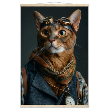 Dieses exklusive Kunstposter zeigt eine charismatische Katze als stilvollen Zeitreisenden, gekleidet in ein aufwendig gestaltetes Steampunk-Vintage-Outfit. Der tiefblaue Mantel mit feinen Karomustern, edlen Lederdetails und einer antik anmutenden goldenen Uhr erzählt eine visuelle Geschichte voller Eleganz, während retro-futuristische Brillen mit bronzefarbenen Akzenten dem Motiv eine abenteuerliche, fantasievolle Note verleihen. Vor einem dunklen, atmosphärischen Hintergrund kommt die ausdrucksstarke Erscheinung und die detailreiche Gestaltung besonders eindrucksvoll zur Geltung und macht das Werk zu einem echten Blickfang für anspruchsvolle Wohnräume.