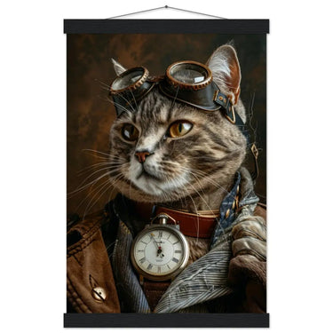 Dieses stilvolle Schulposter im Kunststil zeigt einen männlichen Chausie-Kater in einem klassischen Vintage-Steampunk-Outfit, das Stärke mit eleganter Zurückhaltung verbindet. Er trägt einen braunen Mantel mit dezenten Nähten und sorgfältig gesetzten Lederakzenten, die ihm eine selbstbewusste und zugleich ruhige Ausstrahlung verleihen. Um seinen Hals liegt eine antik wirkende silberfarbene Taschenuhr, die einen spannenden Kontrast zum Mantel bildet und der Komposition eine zeitlose, mechanische Note verleiht. Sein Ausdruck wird von großen retro-futuristischen Schutzbrillen mit bronzefarbenen Metalldetails eingerahmt, die ihm die Ausstrahlung eines abenteuerlichen Entdeckers verleihen. Fellartige Manschetten an den Pfoten vollenden das Outfit mit Struktur und harmonischer Balance.
