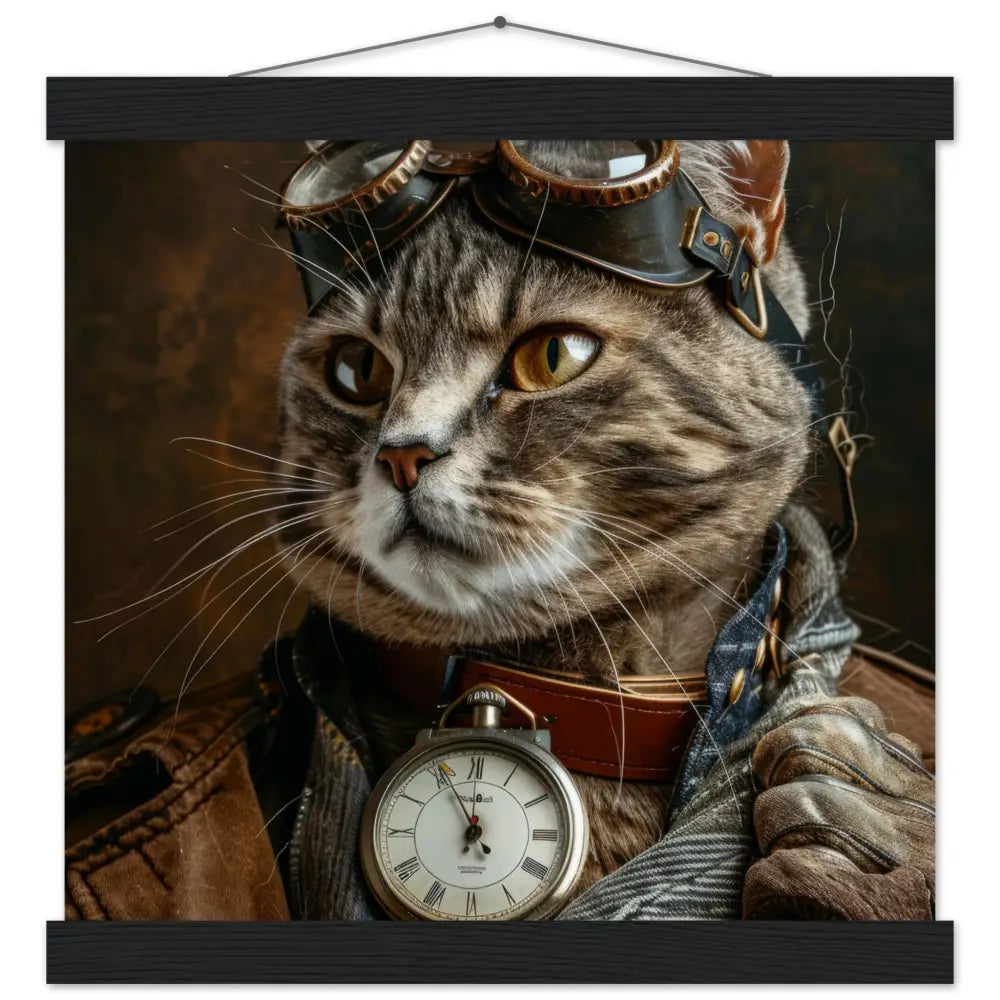 Dieses ausdrucksstarke Schulposter zeigt einen männlichen Chausie-Kater als mutigen Steampunk-Entdecker und verbindet markante Eleganz mit industrieller Nostalgie. Er trägt einen stilvollen braunen Mantel mit feinen Nähten und edlen Lederakzenten, die seiner Erscheinung eine selbstbewusste und abenteuerliche Ausstrahlung verleihen. Eine silberfarbene Uhr im antiken Stil ruht an seinem Hals und bildet einen spannenden Kontrast zu seinem Fell, während große retro-futuristische Brillen mit bronzefarbenen Metalldetails seinen charakterstarken, wagemutigen Look unterstreichen. Weiche Fellmanschetten an seinen Pfoten vollenden das Ensemble und verleihen dem Motiv zusätzliche Tiefe und Ausdruck.