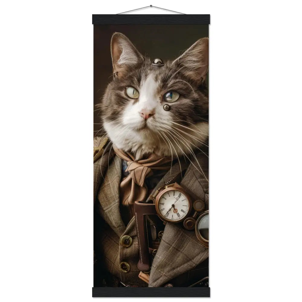 Dieses exklusive Schulposter im Art-Stil zeigt einen männlichen Manx-Kater in einer edlen Vintage-Steampunk-Inszenierung, die ruhige Selbstsicherheit und zeitlose Eleganz ausstrahlt. Er trägt einen eleganten braunen Mantel mit dezenten Karomustern und kupferfarbenen Knöpfen, die die handwerkliche Qualität des Designs betonen. Um seinen Hals hängt eine antik anmutende bronzefarbene Taschenuhr, die perfekt mit den warmen Farbtönen seines Outfits harmoniert. Sein Ausdruck wird von kunstvoll gestalteten retro-futuristischen Schutzbrillen mit kupferfarbenen Metalldetails gerahmt, die dem Porträt eine geheimnisvolle Tiefe verleihen. Verfeinerte Lederakzente und kontrastierende Nähte an seinen Pfoten vollenden den Look mit präziser, maßgeschneiderter Wirkung.