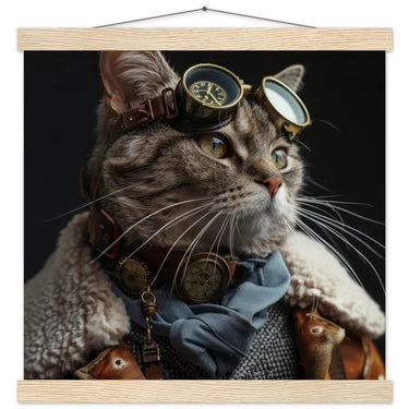 Dieses exklusive Schulposter im Art-Stil zeigt einen männlichen Ocicat-Kater in einer distinguierten Vintage-Steampunk-Inszenierung, die Eleganz mit Entdeckergeist verbindet. Er trägt einen edlen grau karierten Mantel mit dezenten Lederakzenten und einem warmen, fellartigen Kragen, der einen stilvollen Kontrast schafft. Um seinen Hals ruht eine antik anmutende Taschenuhr in tiefem Goldton, die seine aristokratische Ausstrahlung unterstreicht. Sein Ausdruck wird von markanten retro-futuristischen Schutzbrillen mit bronzefarbenen Metalldetails gerahmt, die ihm das Erscheinungsbild eines selbstbewussten und abenteuerlichen Forschers verleihen. Der dunkle, geheimnisvolle Hintergrund lenkt den Blick vollständig auf die kunstvoll ausgearbeitete Kleidung.
