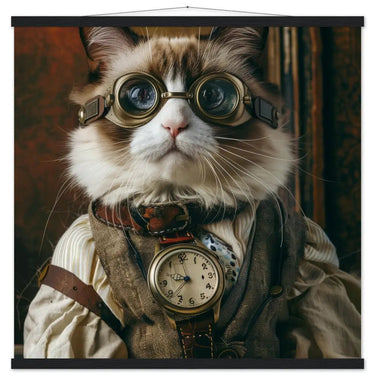 Dieses elegante Schulposter zeigt einen männlichen Snowshoe-Kater als stilvollen Steampunk-Abenteurer und verbindet Raffinesse mit einer geheimnisvollen Ausstrahlung. Er trägt einen sorgfältig gearbeiteten braunen Mantel mit feinen Mustern und detailreichen Kupferakzenten, die dem Motiv Tiefe und handwerklichen Charakter verleihen. Eine bronzefarbene Uhr im antiken Stil ruht an seinem Hals und sorgt für klassische Eleganz, während markante Brillen mit bronzefarbenen Metalldetails ihm eine kraftvolle, entdeckerlustige Präsenz verleihen. Cremefarbene Fellmanschetten an seinen Pfoten setzen einen sanften Kontrast und vollenden das Ensemble, eingebettet in eine kunstvoll gestaltete klassische Wand, die dem Kunstwerk nostalgischen Charme verleiht.