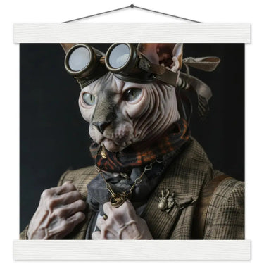 Dieses exklusive Schulposter im Kunststil zeigt einen männlichen Sphynx-Kater in einer ausdrucksstarken Vintage-Steampunk-Inszenierung, in der Eleganz auf stille Intensität trifft. Sein markantes Erscheinungsbild wird durch einen fein karierten Mantel mit dezenten Mustern und antik wirkenden Knöpfen unterstrichen, die dem Motiv eine kultivierte und durchdachte Ästhetik verleihen. Um seinen Hals liegt eine anmutige goldfarbene Taschenuhr, die perfekt mit dem Steampunk-Charakter harmoniert und zeitlose Raffinesse ausstrahlt. Gekrönt wird sein Kopf von eindrucksvollen Schutzbrillen in bronzefarbenem Metall, deren feine Details dem Porträt eine geheimnisvolle und geistige Präsenz verleihen. Zarte Lederakzente und kontrastierende Nähte an den Pfoten runden die Komposition präzise und ausgewogen ab.