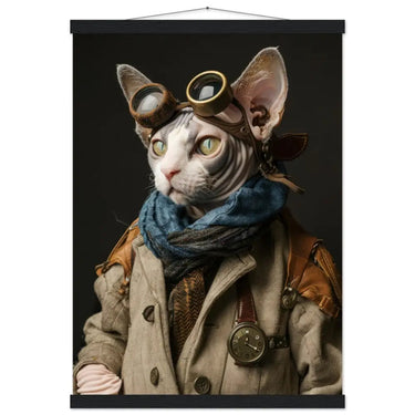Dieses exklusive Schulposter im Art-Stil zeigt einen männlichen Cornish-Rex-Kater in einer markanten Vintage-Steampunk-Inszenierung mit starker Ausstrahlung. Er trägt einen stilvollen beigen Mantel mit dezenten Streifendetails und bewusst gealterten Lederakzenten, die dem Design eine authentische, zeitlose Wirkung verleihen. Um seinen Hals hängt eine antik anmutende bronzefarbene Taschenuhr, die seine ruhige Eleganz und selbstbewusste Präsenz unterstreicht. Sein Kopf wird von einer robusten Schutzbrille mit bronzefarbenen Metalldetails und dunklen Gläsern gekrönt, die ihm eine abenteuerliche und geheimnisvolle Ausstrahlung verleiht. Zurückhaltende Ledermanschetten an seinen Pfoten setzen einen stilvollen Akzent und runden das Ensemble harmonisch ab.