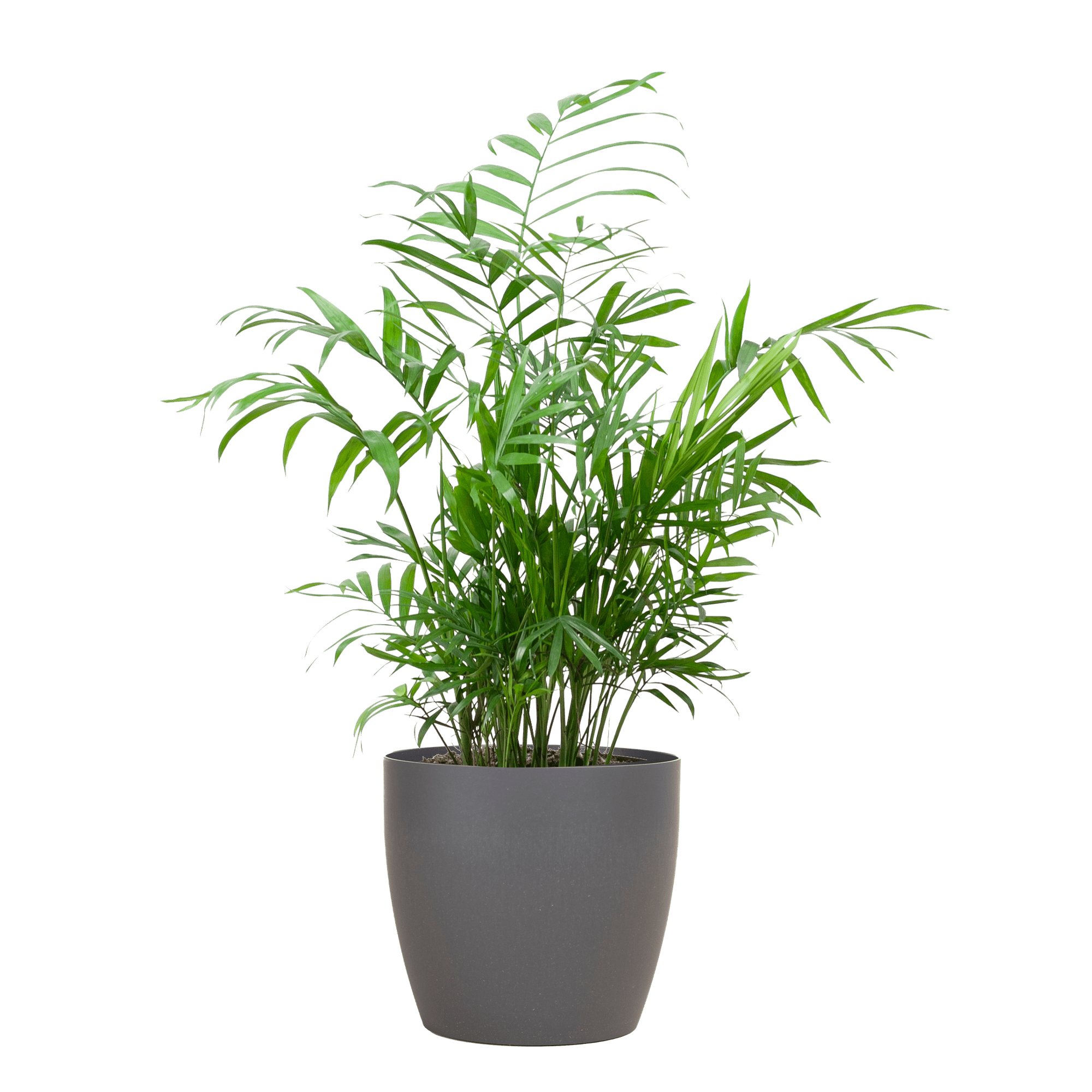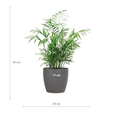 Pflanzenname: Chamaedorea Elegans Spitzname: Mexikanische Zwergpalme Herkunft: Feuchtes, schattiges Unterholz südamerikanischer Wälder Blätter: Elegante, federartige, frischgrüne Blätter Blüten: Keine – wird wegen ihres attraktiven Laubs geschätzt Besonderheiten: Gedeiht bei indirektem Licht – ideal für lichtarme Innenbereiche Der lateinische Name betont den bescheidenen, aber anmutigen Charakter Geringer Wasserbedarf und anpassungsfähig an verschiedene Lichtverhältnisse (kein direktes Sonnenlicht) Pflegeleicht – geeignet für Anfänger und erfahrene Pflanzenfreunde Topf-Spezifikationen: Viber-Topf Material: Bioplastik mit in den Niederlanden angebautem Elefantengras Farbe: Natürlich mit Kreide gefärbt – weicher, heller Naturton Nachhaltigkeit: Vollständig biologisch abbaubar und umweltfreundlich Design: Neutrale Optik – passt sich vielen Einrichtungsstilen problemlos an