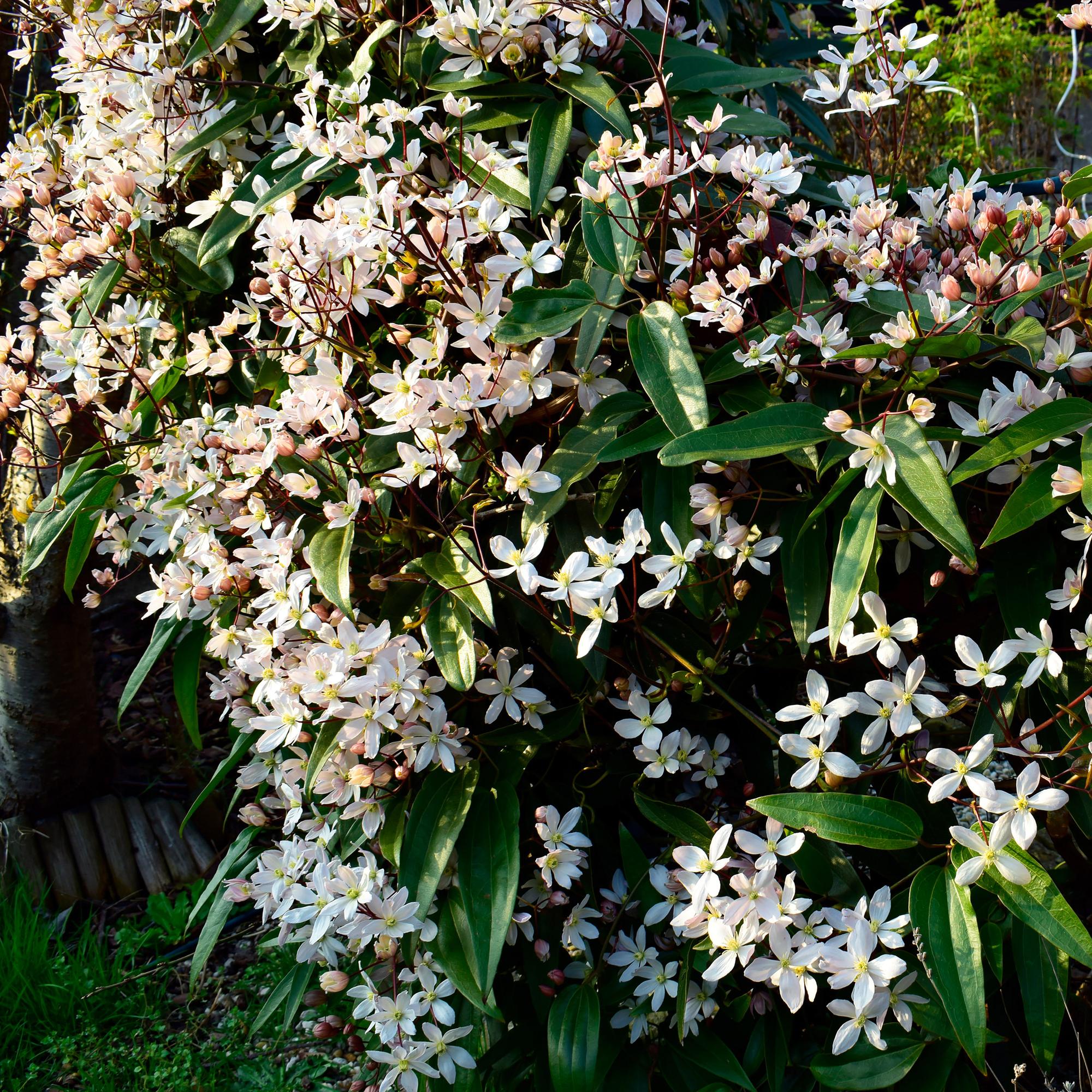 Die Clematis armandii blüht im frühen Frühjahr mit weißen bis cremigen Blüten, die einen süßen Duft verbreiten. Die Blätter sind glänzend und dunkelgrün, was die Pflanze das ganze Jahr über attraktiv macht.