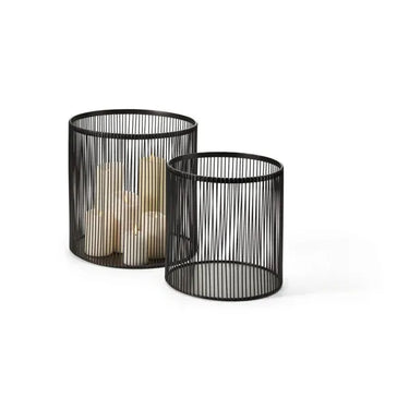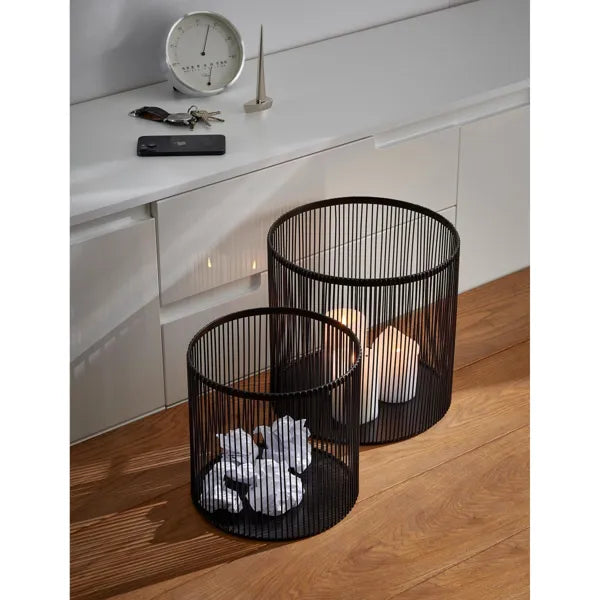 Jedes Stück ist handgefertigt, und die bewusst ungleichmäßige Anordnung der geraden Drahtstäbe verleiht ihm den für Nobo typischen, anmutigen und unverwechselbaren Charakter. Über die Nutzung als Laterne hinaus lässt sich dieses vielseitige Objekt auch als stilvoller Behälter verwenden – ideal als Papierkorb, zur Aufbewahrung von Wolle oder für ordentlich arrangierte Zeitschriften.