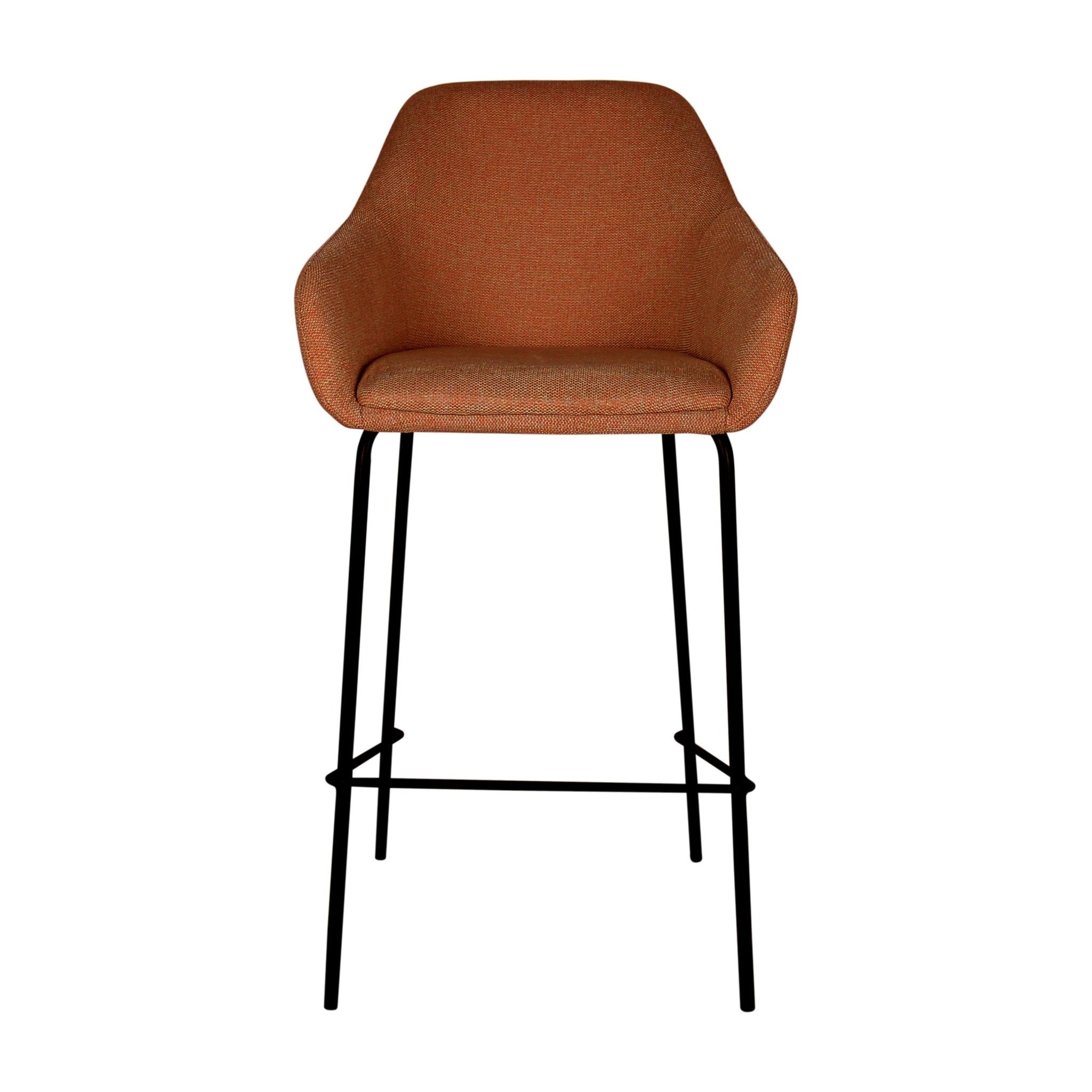 Der Kick Collection Barhocker Suus in der Farbe Terra kombiniert modernes Design mit hohem Sitzkomfort. Die ergonomisch gestaltete Sitzfläche mit Armlehnen ist mit einem melierten Strukturstoff bezogen, der dem Hocker eine elegante und zeitlose Optik verleiht. Das schlanke Untergestell aus schwarzem Metall sorgt für Stabilität und einen modernen Look. Mit einer Sitzhöhe von 67 cm eignet sich der Hocker ideal für Kücheninseln oder Bars.