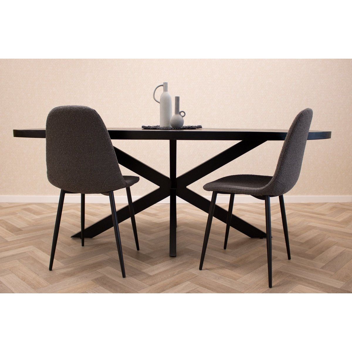 Der Kick Collection Eetkamerstoel Mees in Dunkelgrau vereint stilvolles Design mit hohem Sitzkomfort. Die Sitzschale ist mit hochwertigem Bouclé-Stoff bezogen, der durch seine weiche und strukturierte Oberfläche überzeugt. Das robuste schwarze Stahlgestell sorgt für Stabilität und verleiht dem Stuhl einen modernen, eleganten Look. Die runden Linien und dezenten Nähte der Sitzschale verleihen dem Mees-Stuhl zudem eine markante und zugleich ansprechende Optik, die ihn zu einem Blickfang in jedem Esszimmer macht.