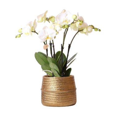 Zimmerpflanze Phalaenopsis Orchid in Silver Groove Decorative Pot – 'Jewel Ghent' White | Kolibri Orchids