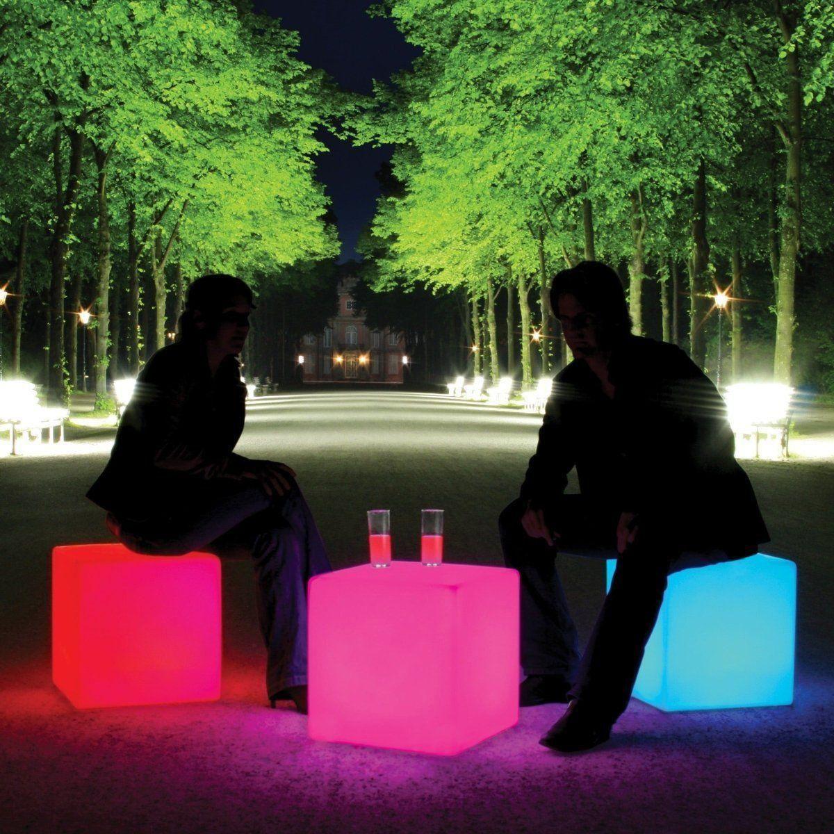 Die Outdoorversion mit wasserfestem, schwarzem Kabel erleuchtet Gärten, Terrassen oder Parks bei Events und bietet gleichzeitig Sitzfläche.