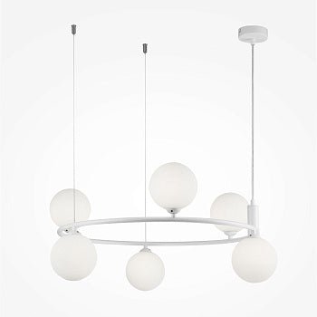 Die Pendelleuchte MOD013PL-06W von Maytoni vereint modernes Design mit funktionaler Eleganz. Der weiße Metallrahmen in Ringform harmoniert stilvoll mit sechs matten, weißen Glasdiffusoren in Kugelform und sorgt für eine gleichmäßige, angenehme Beleuchtung. Diese Leuchte eignet sich ideal für Esszimmer, Kücheninseln oder als dekoratives Highlight in modernen Wohnräumen. Ausgestattet mit sechs G9-Fassungen unterstützt sie jeweils eine maximale Leistung von 25 W (Leuchtmittel nicht enthalten) und besteht aus hochwertigem Metall und Glas.