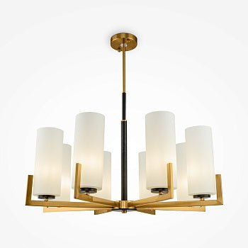 Der edle Kronleuchter MOD089PL‑08BS der Marke Maytoni aus der Serie „Fortano“ verbindet ein elegantes Metallgestell im Messing‑Look mit einem zentralen Stab in mattschwarz. Das Gestell trägt acht zylindrische Glasschirme in Weiß, wodurch das Licht weich gestreut wird und eine harmonische Atmosphäre entsteht.