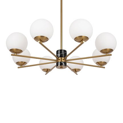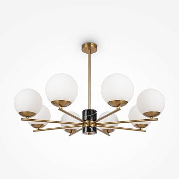 Die Maytoni Marble MOD187PL-08BS Pendelleuchte vereint luxuriöse Materialien mit modernem Design. Der elegante Rahmen aus messingfarbenem Metall wird durch feine schwarze Marmorelemente und acht kugelförmige Schirme aus opalweißem Glas ergänzt. Diese Kombination erzeugt ein harmonisches Gleichgewicht zwischen Wärme und Kontrast, wodurch die Leuchte sowohl in klassischen als auch modernen Interieurs ein stilvolles Statement setzt.