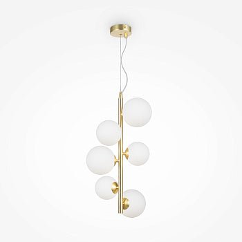 Die Pendelleuchte Dallas von Maytoni (Modell MOD545PL-06BS) überzeugt durch ihr skulpturales Design, das an die Struktur eines Moleküls erinnert. Der mattgoldene Metallrahmen trägt sechs opale, mundgeblasene Glasdiffusoren in weißer Farbgebung, die das Licht gleichmäßig streuen und für eine angenehme Beleuchtung in Wohnräumen, Essbereichen oder Hotellobbys sorgen.