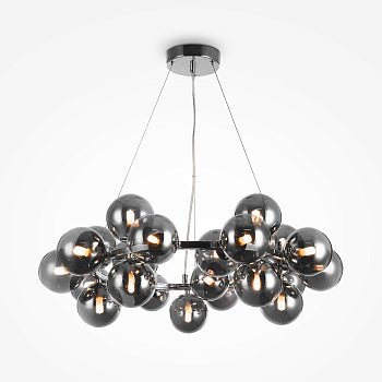 Die Pendelleuchte Dallas von Maytoni (Modell MOD548PL-25CH) kombiniert modernes Design mit luxuriösem Flair. Der verchromte Metallrahmen trägt 25 kugelförmige Glasschirme in rauchgrauer Spiegeloptik, die ein warmes und einladendes Licht erzeugen. Mit einem Durchmesser von 69 cm wird die Leuchte zum stilvollen Blickfang in Wohnzimmern, Essbereichen oder Eingangsbereichen.