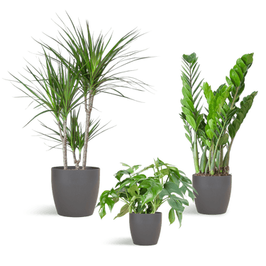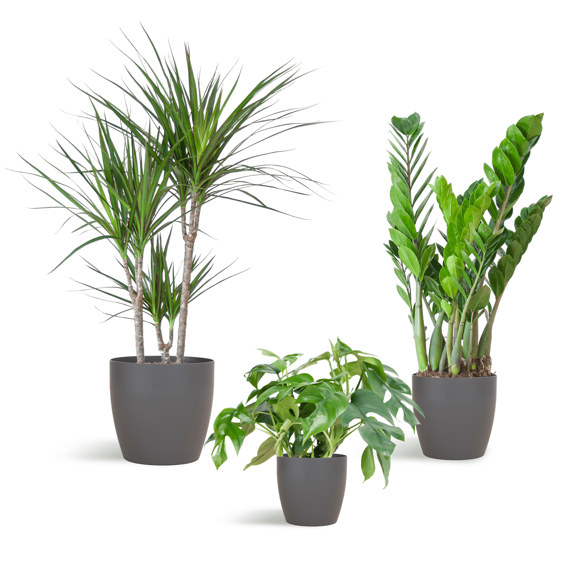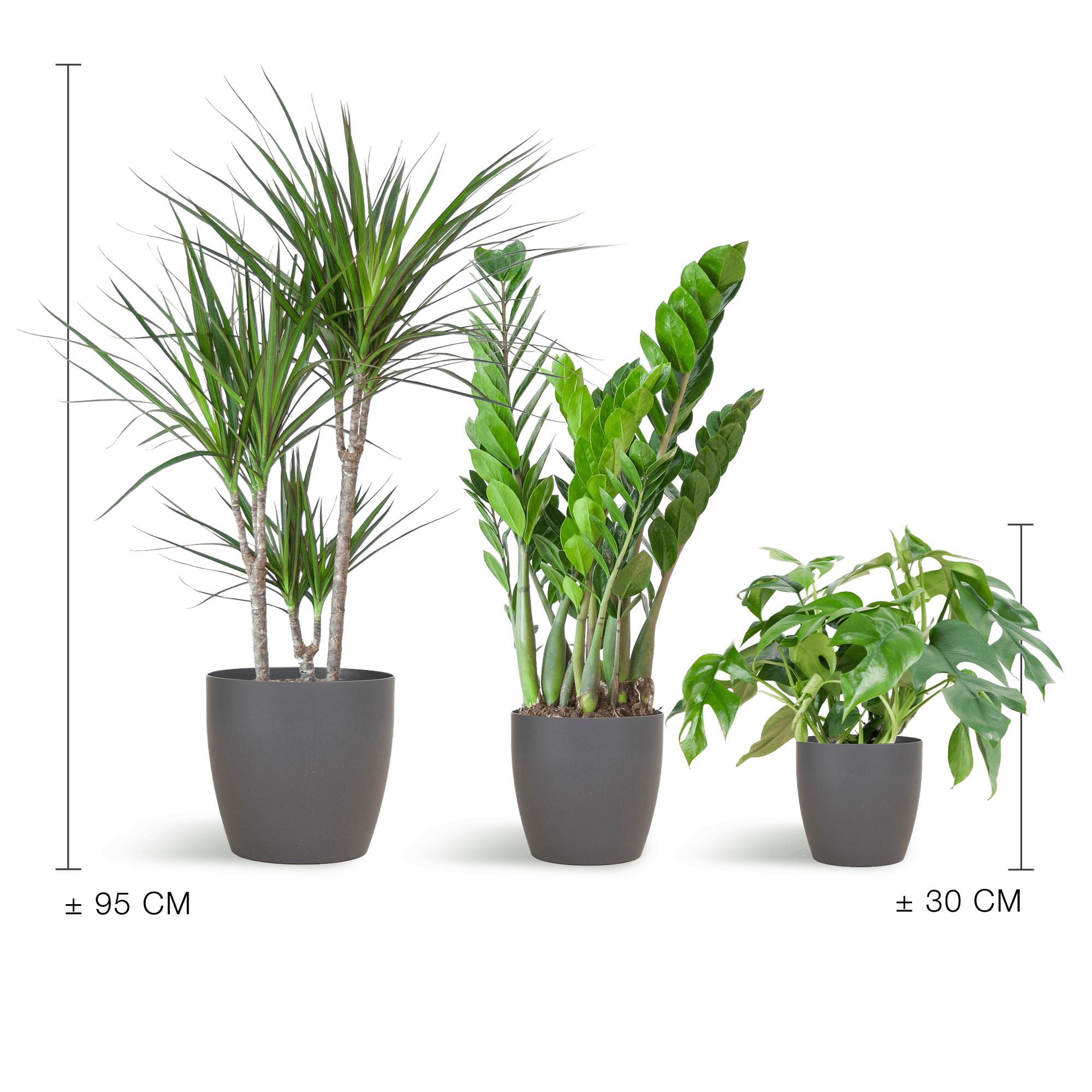 Schatten-Pflanzenbox Enthält: Monstera Minima (12 cm Topf, 25 cm Höhe) Zamioculcas Zamiifolia (17 cm Topf, 60 cm Höhe) Dracaena Marginata (21 cm Topf, 95 cm Höhe) Topf: Biologisch abbaubarer Viber-Topf aus Biokunststoff und Elefantengras, natürliche helle Farbe Lichtbedarf: Halbschatten, indirektes Tageslicht (nicht komplett im Schatten) Besonderheiten: Ideal für weniger helle Innenbereiche, umweltfreundlicher Topf, stilvolles natürliches Design