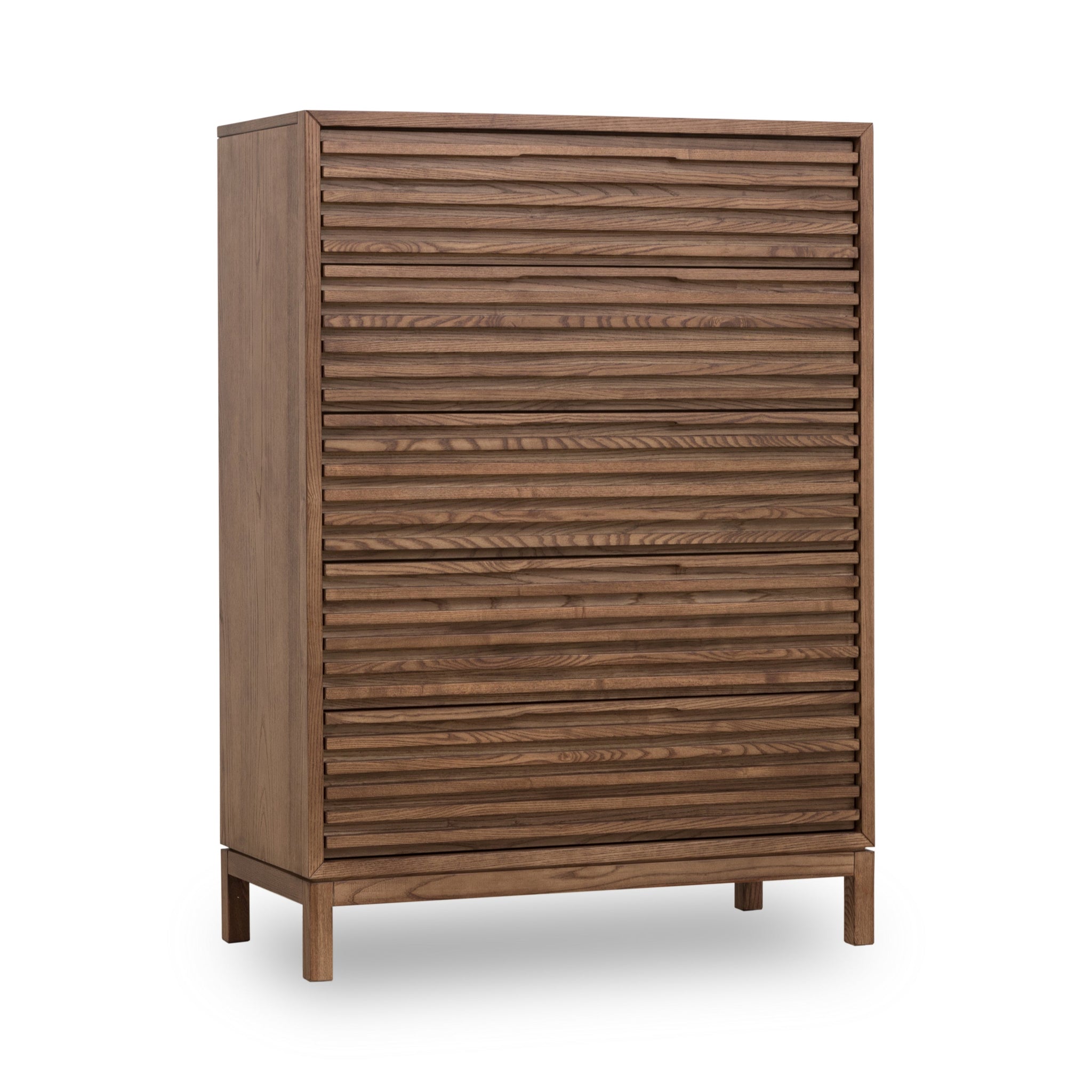 Die Kommode verfügt über fünf geräumige Schubladen, die jeweils mit Vollauszug-Seitenmontage-Ballbearing-Schubladenschienen ausgestattet sind, um eine reibungslose und effiziente Handhabung zu gewährleisten. Die oberen Schubladen beinhalten herausnehmbare Filzeinsätze, die sich ideal für die Aufbewahrung empfindlicher Gegenstände eignen. Die robuste Konstruktion umfasst fünfflächige Schubladenkästen aus Holzfurnier mit Vorder- und Rückwänden, die mit englischer Schwalbenschwanzverbindung versehen sind, um zusätzliche Stabilität und langlebige Qualität zu gewährleisten. Die Lamellenfronten, die vollständig aus massivem Eschenholz mit Eschenholzfurnier-Oberflächen bestehen, verleihen dem Stück eine einzigartige Textur und visuelle Tiefe. Die Beine sind mit nicht-markierenden Nylon-Glidefüßen ausgestattet, die für überlegene Stabilität sorgen, wodurch dieses Möbelstück sowohl funktional als auch ästhetisch ansprechend ist. Hergestellt in Vietnam, ist die Tanner Fünfschubladen-Kommode eine elegante und praktische Ergänzung für jedes Schlafzimmer.