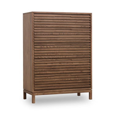 Die Modus Furniture Tanner Fünfschubladen-Kommode aus Eschenholz in Roux ist ein elegantes und funktionales Möbelstück, das jedes moderne Schlafzimmer aufwertet. Teil der Tanner-Kollektion kombiniert sie auf wunderbare Weise skandinavischen Minimalismus mit japanischer Wärme und verkörpert die Japandi-Designästhetik. Die Kommode ist aus massivem Eschenholz mit Eschenholzfurnier gefertigt und bietet eine natürliche, erdige Ausstrahlung, die sowohl langlebig als auch stilvoll ist. Das Roux-Finish verleiht der Kommode einen tiefen Braunton und gibt ihr einen reichen, erdigen Charakter, während die matte Lackoberfläche für einen raffinierten, unaufdringlichen Glanz sorgt.